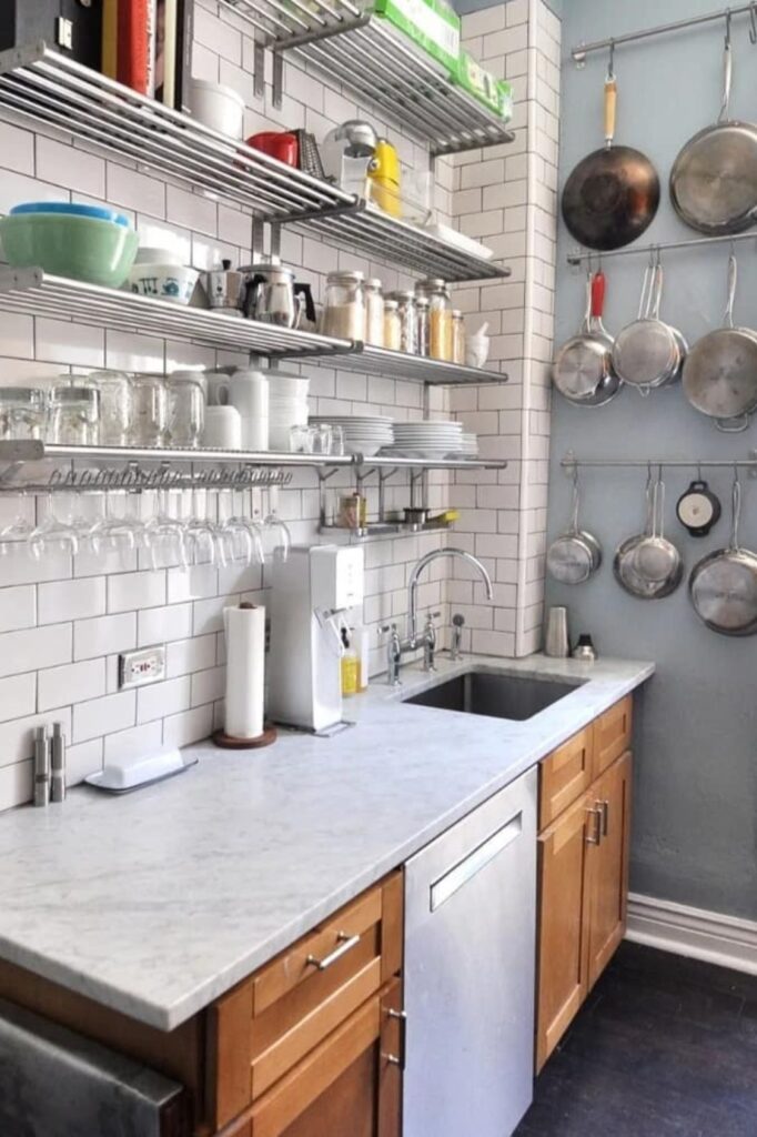 Blank walls above the sink can carry far more than you think. Long metal rail shelves like these turn that space into a full storage system without adding bulky cabinets.