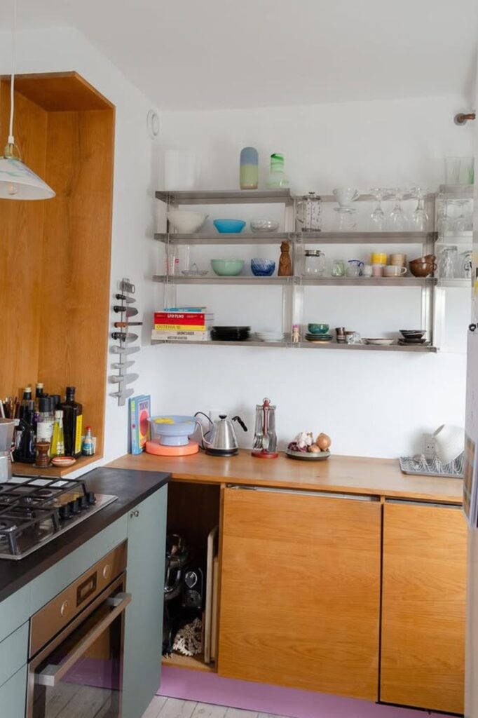 Cooking feels easier when everything sits right where you can see it. Wall-mounted steel shelves like these keep dishes, glasses, and bowls out in the open.