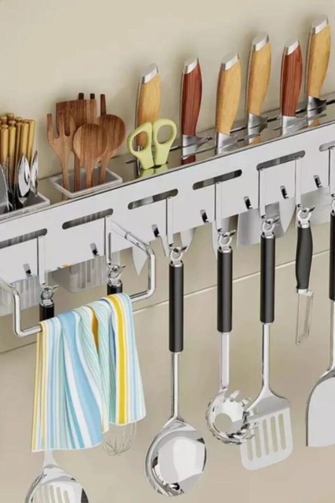 Cooking gets messy fast when utensils are scattered across drawers and countertops. A wall-mounted tool station like this keeps everything in one place.