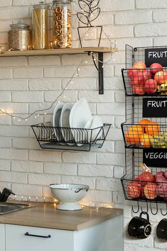 Vertical baskets are great for small kitchens because they use height instead of surface space. To keep things neat, put different things on each level, like fruits, vegetables, or snacks.