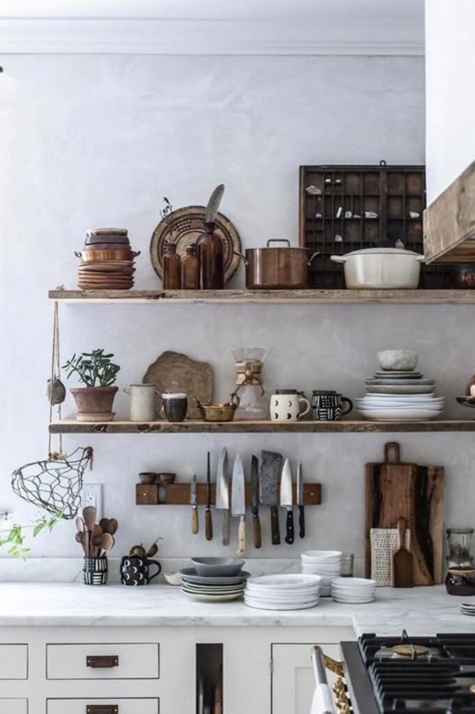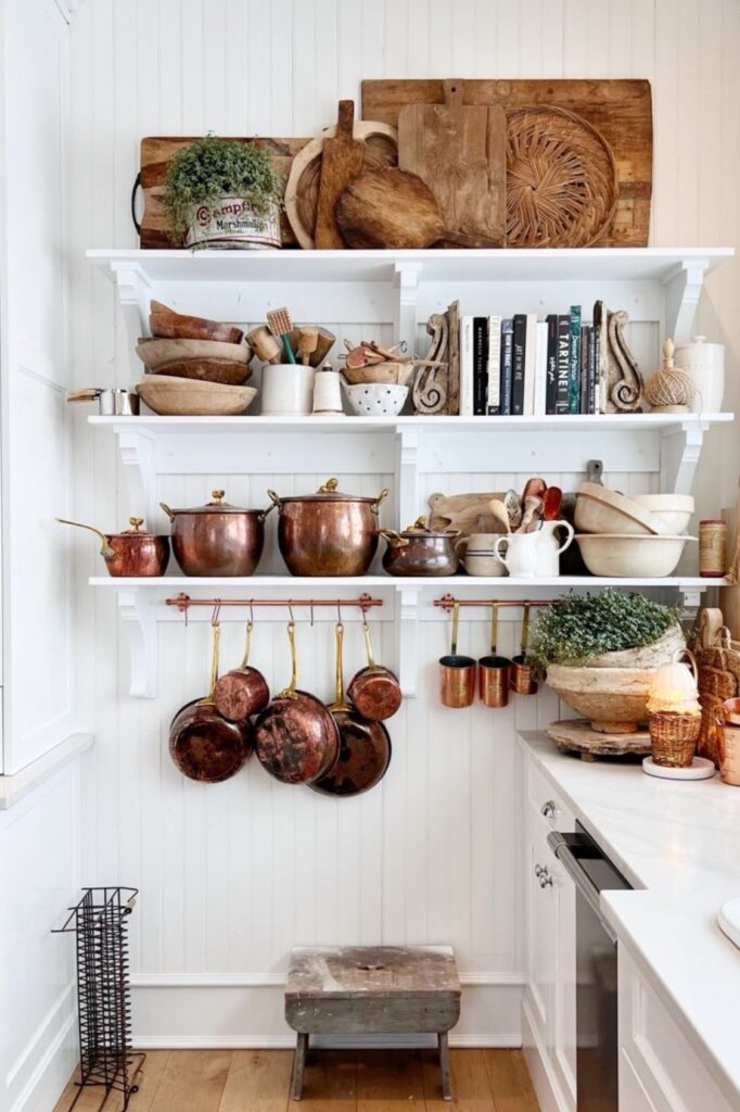 It looks great when you show off copper or metal cookware like this. The shelves above can house bowls, books, or serving dishes.