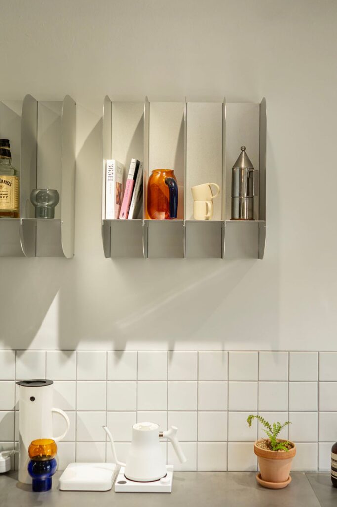 Loose items like mugs, books, or small jars often get stacked awkwardly on regular shelves. Divided wall shelves like these fix that by giving each item its own space.