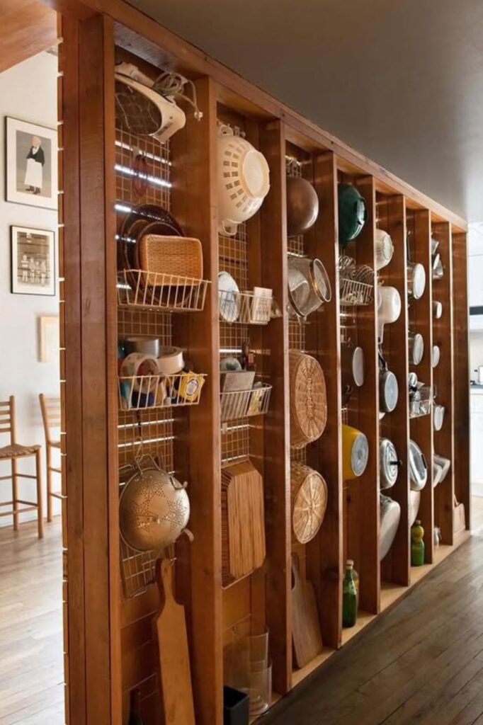Large kitchens often have unused divider walls that do nothing except separate spaces. Turning that wall into vertical storage like this gives you room for pans, trays, baskets.
