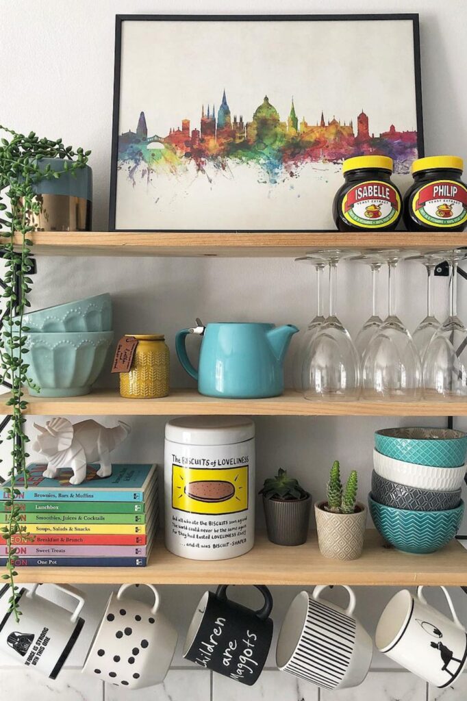 Put the shelves up in layers, making sure there is enough room between each one so that higher things don’t seem crammed.