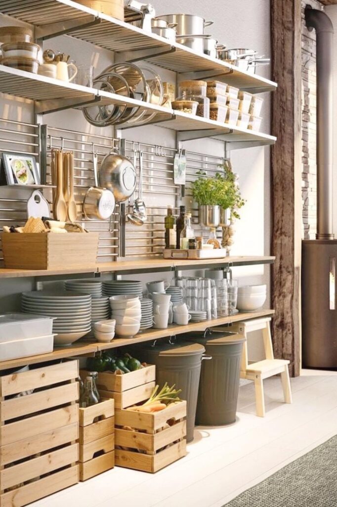 And the bottom shelves hold heavy stuff like crates or dishes. You can even put fruits and vegetables in open boxes so you can see them and get to them easily.