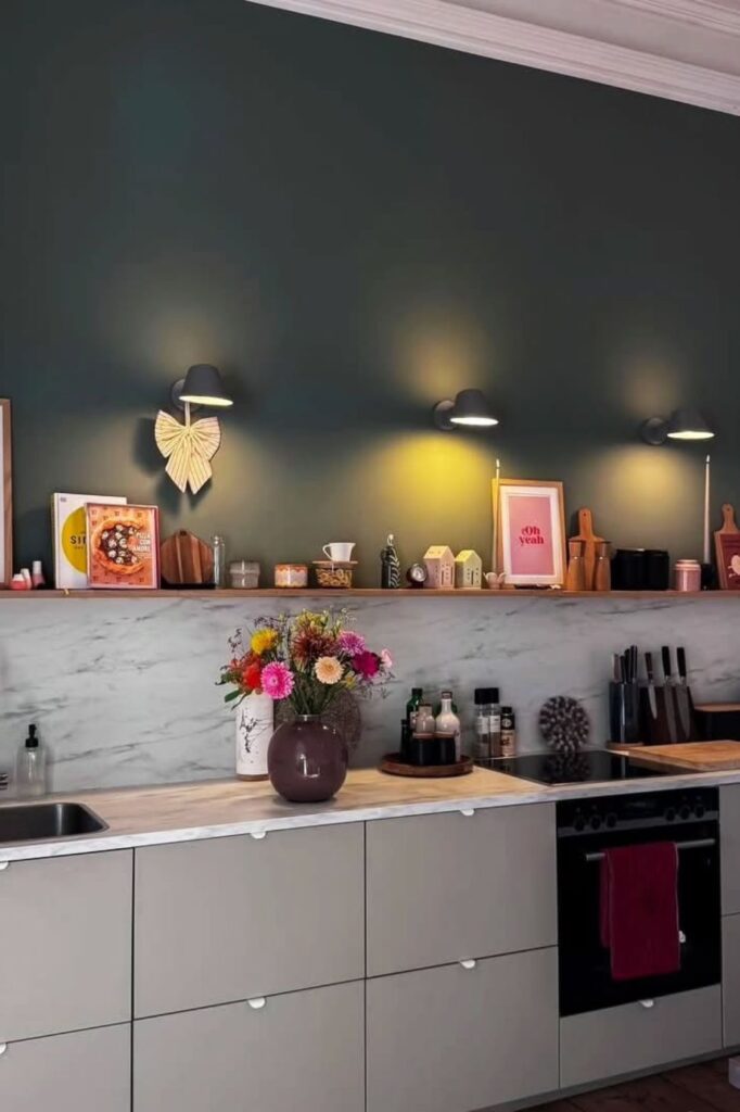 Walls above your backsplash don’t always need bulky shelves to be useful. A simple narrow ledge like this keeps small items lined up without taking over the space.