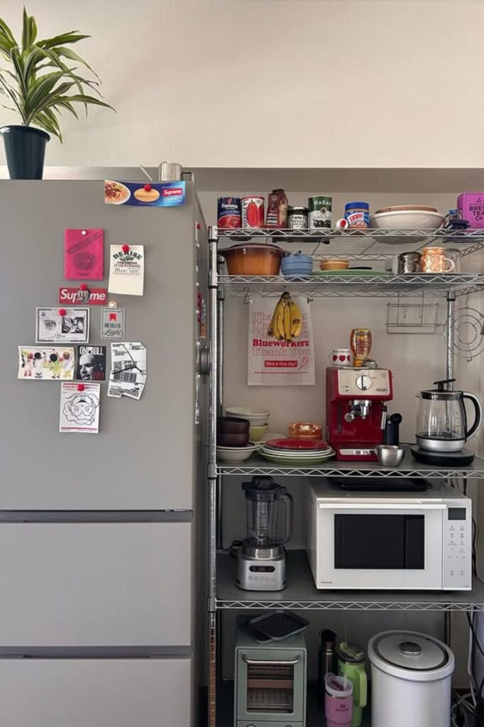 This tall metal rack makes that empty space a full storage area without getting in the way of your cabinets.
