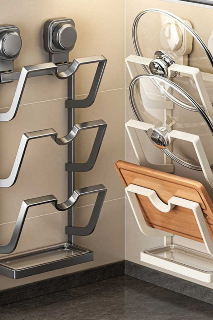 Crowded cabinets usually hide your pot lids where you can’t see or reach them easily. Mounting a slim wall rack like this near your cooking area solves that instantly.