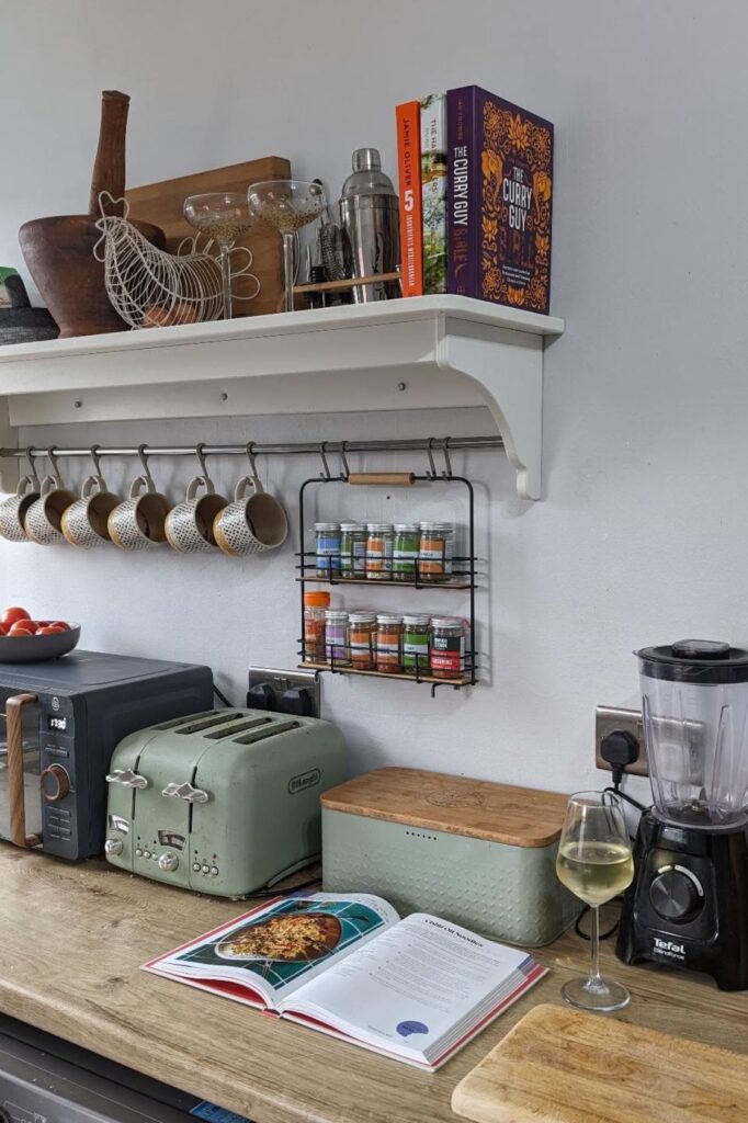 Adding a bottom rail with hooks is a good way to hang cups or cutlery and keep your counter uncluttered.