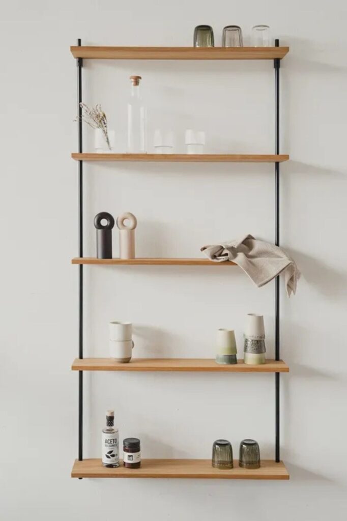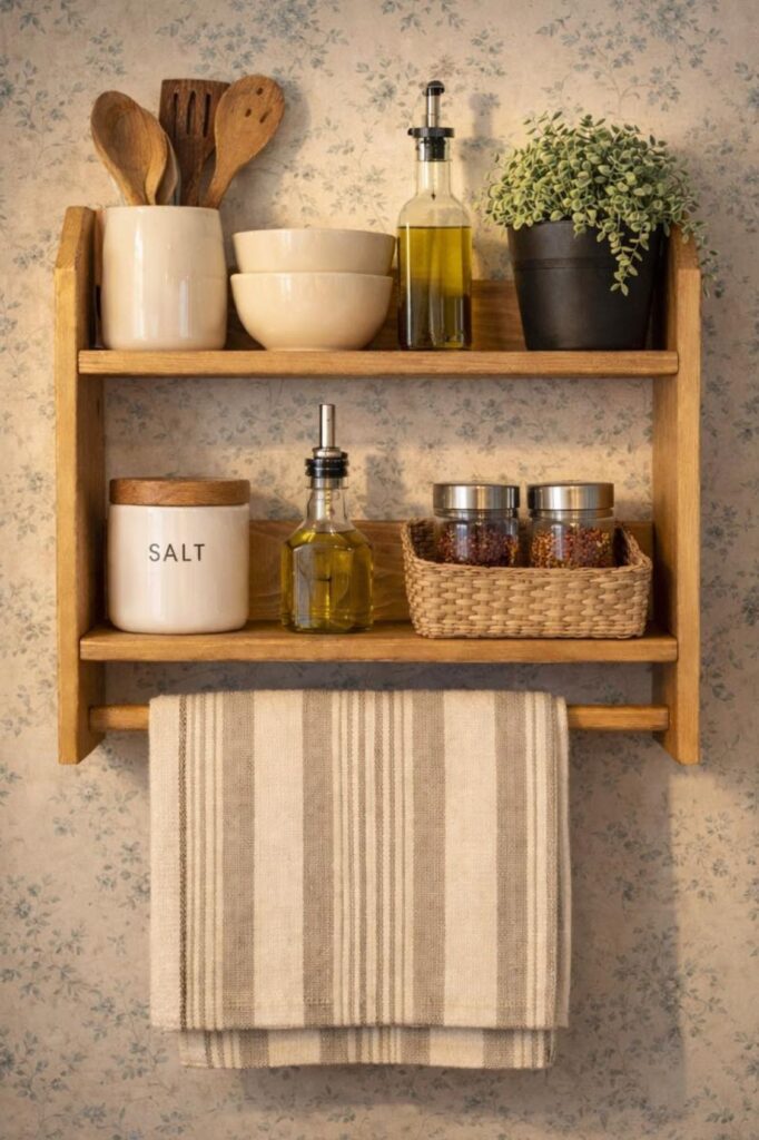 Simple wooden shelves can carry a lot more than just decor when you use them the right way. Layering two shelves like this gives you space for plates, jars, and cookware.