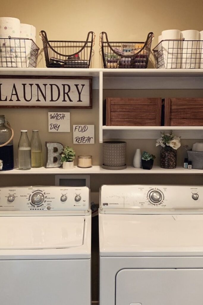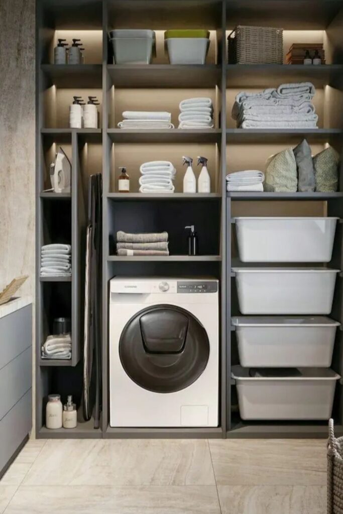 Laundry spaces become far easier to manage once everything lives on one organized wall. A full shelving system like this turns the entire back wall into a structured layout.