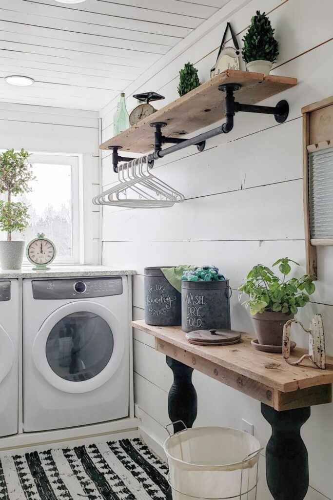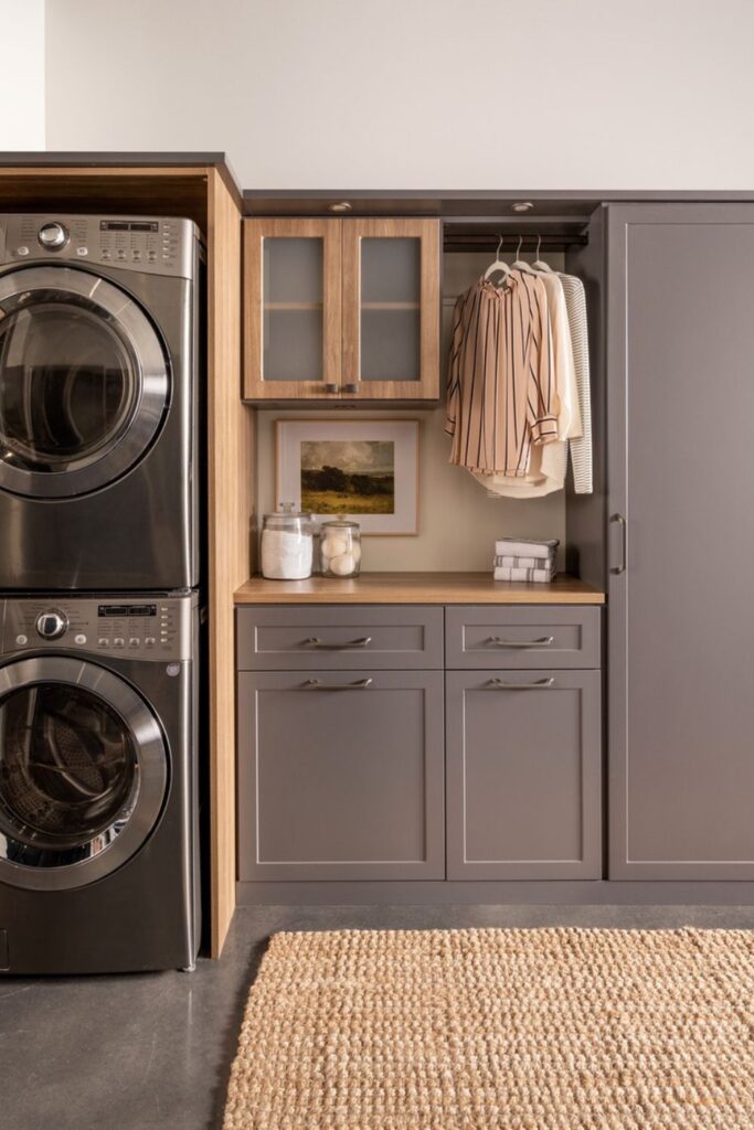 Adding a countertop over the machines makes them even more useful. You can fold clothes there, and the hanging rack can hold things that shouldn’t get wrinkled.