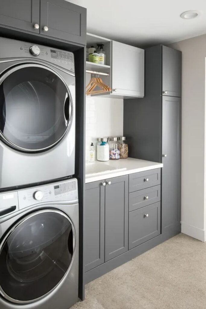 When you stack machines, the wall around them is free for a full storage system. The lower cabinets keep heavier things and extra laundry supplies.