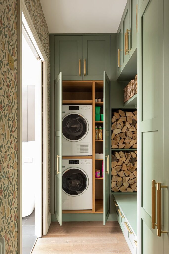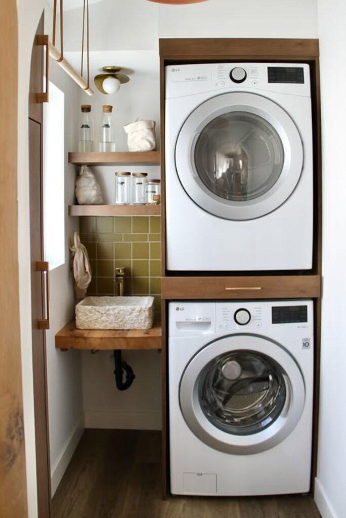 Wall space beside stacked machines often sits empty, even though it’s one of the easiest places to add storage.