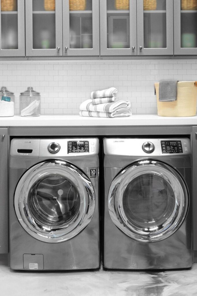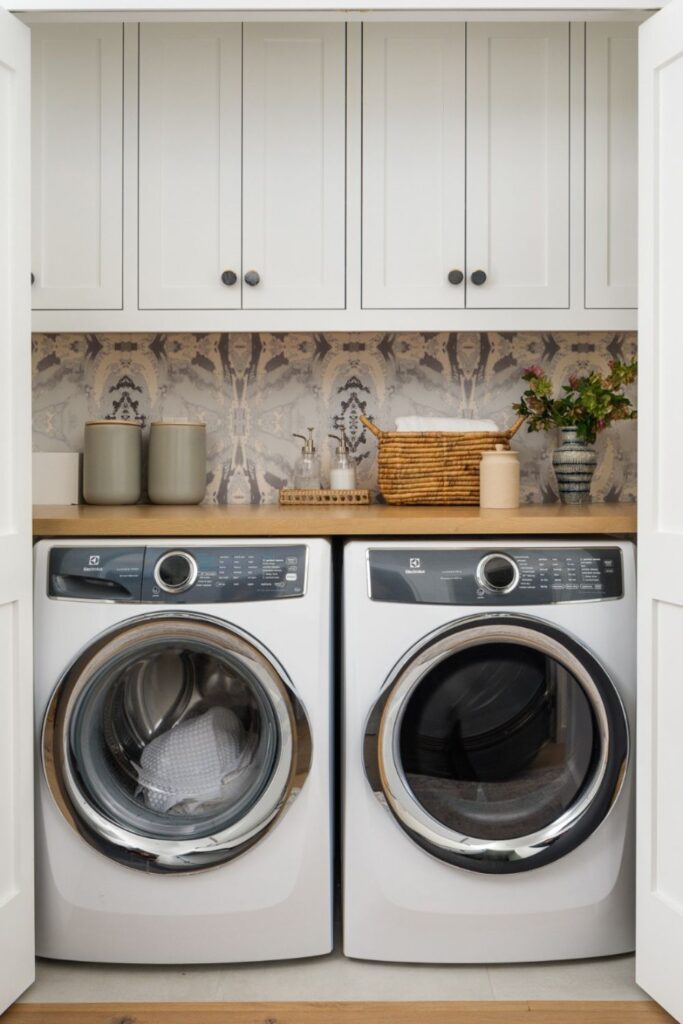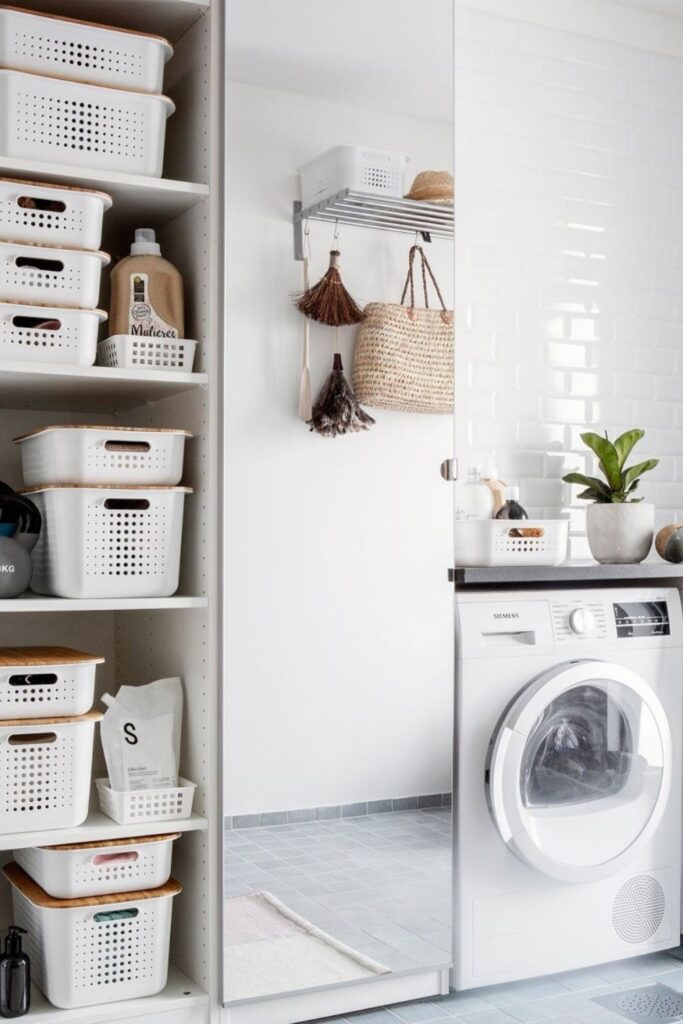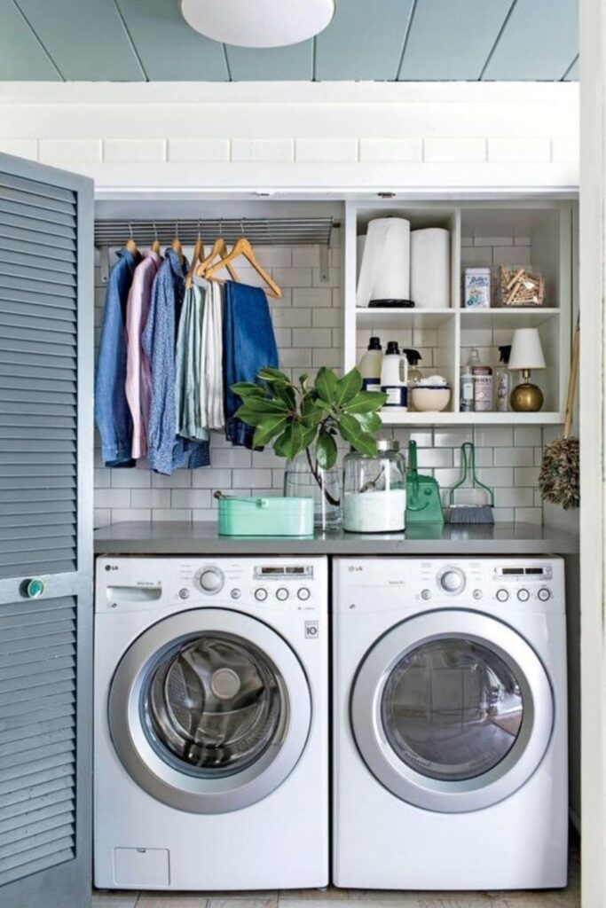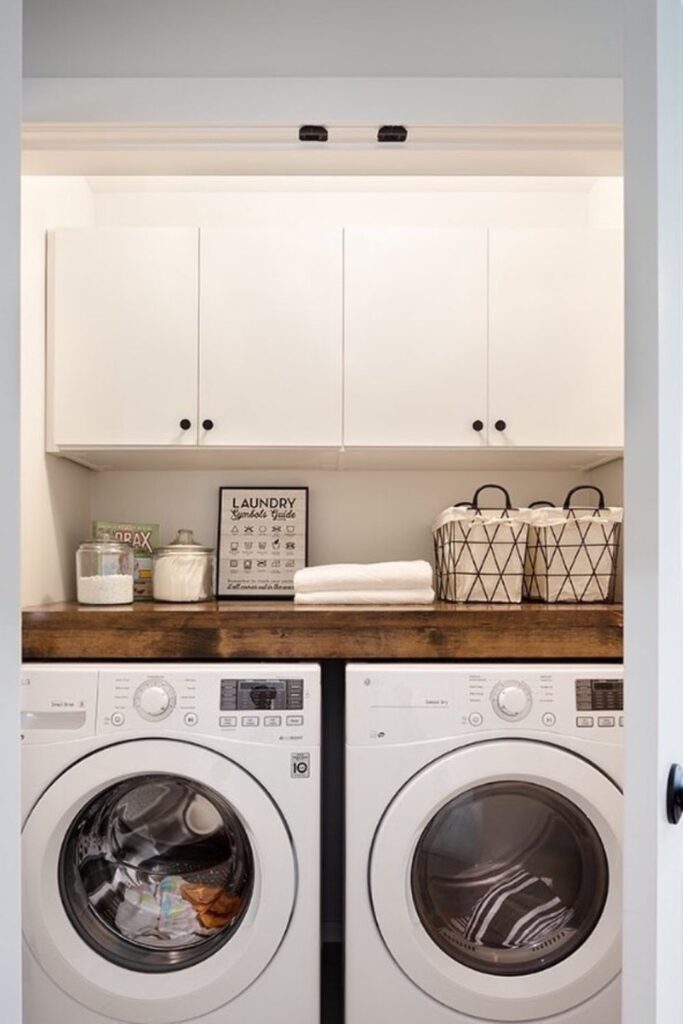 Begin with the parts that most people don’t pay attention to, such doors and walls. A modest shelf above the machines can house labeled boxes or baskets for supplies.