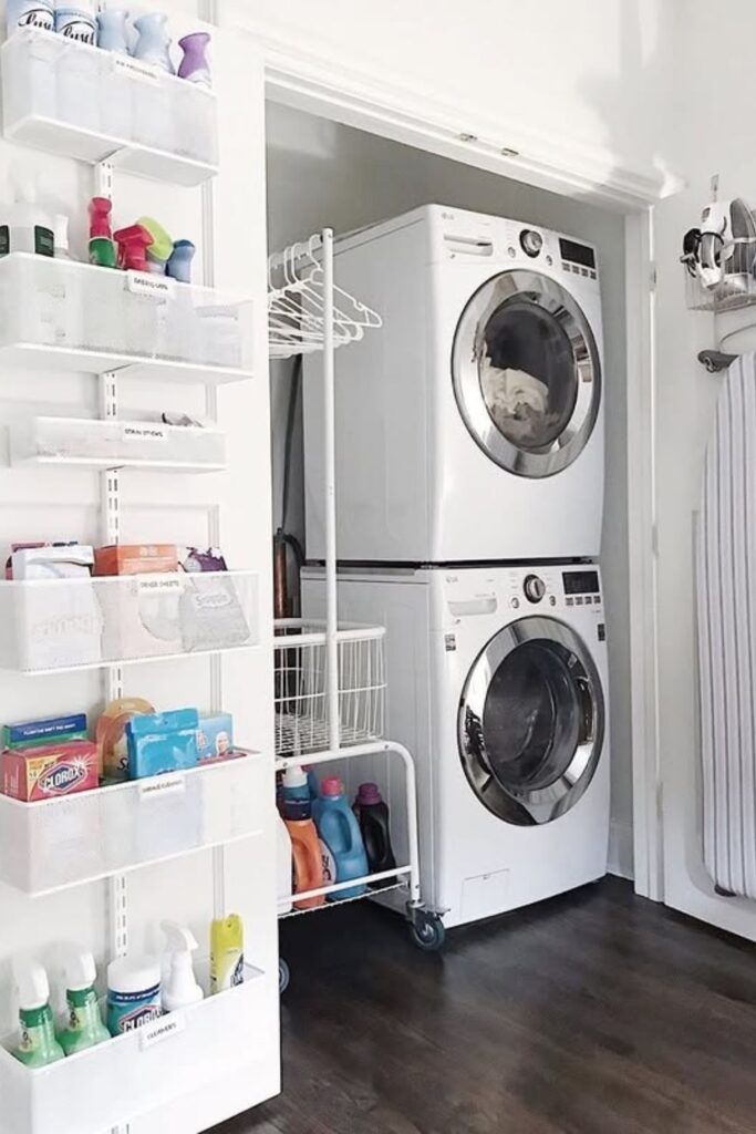 Empty wall space can hold far more than most laundry closets use. A vertical wall organizer like this turns a blank side wall into a complete supply station where every product has its own shelf.