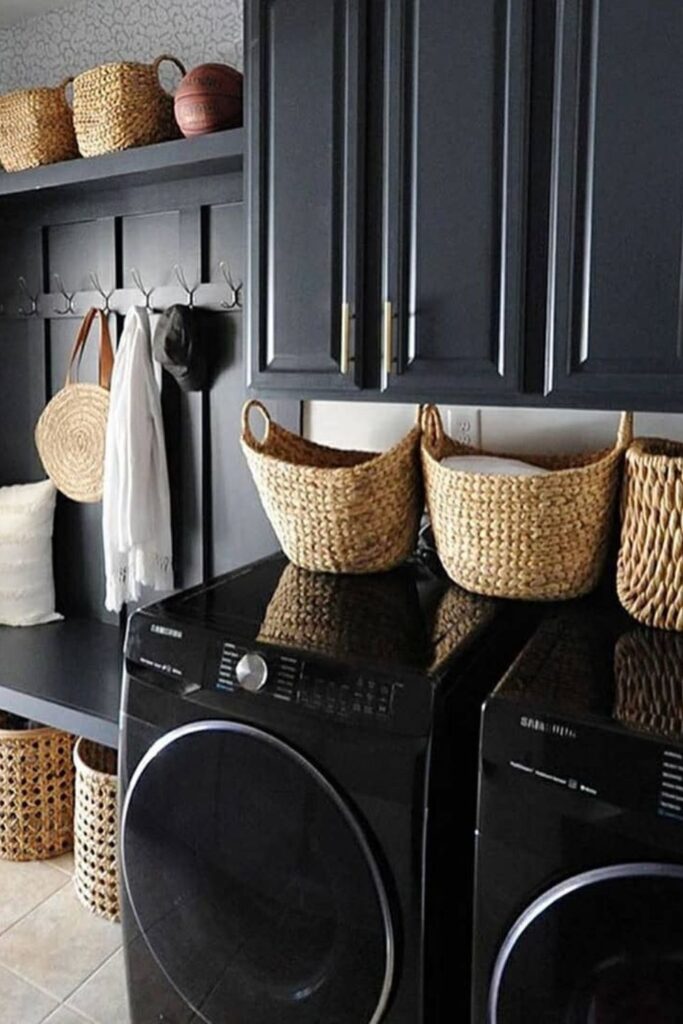 Laundry spaces become much easier to manage when everyday items have a quick place to land.
