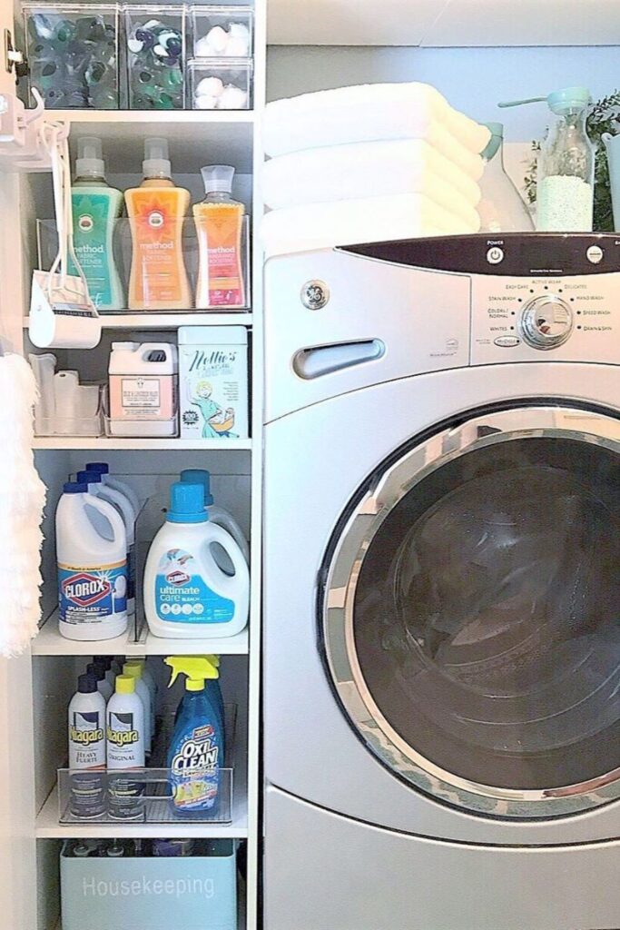 A narrow supply tower like this keeps everything organized in one vertical column right beside the washer.