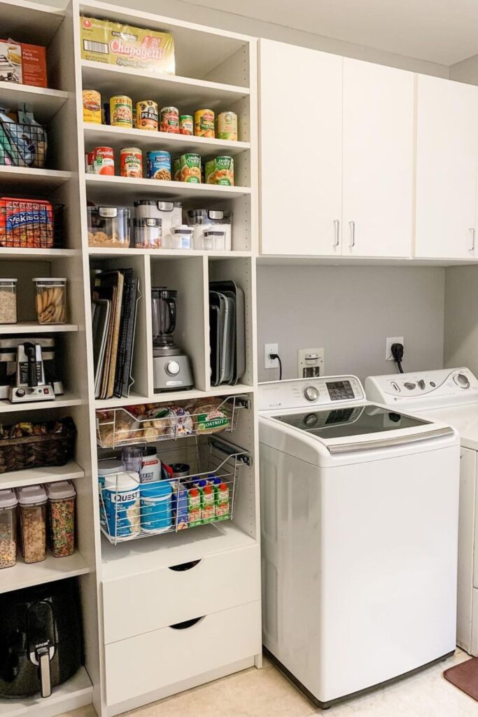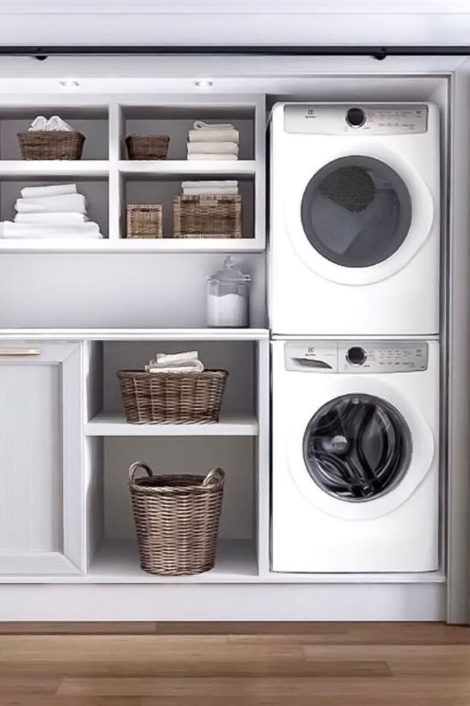 Laundry areas start to feel organized when storage is built around the machines instead of scattered across shelves.