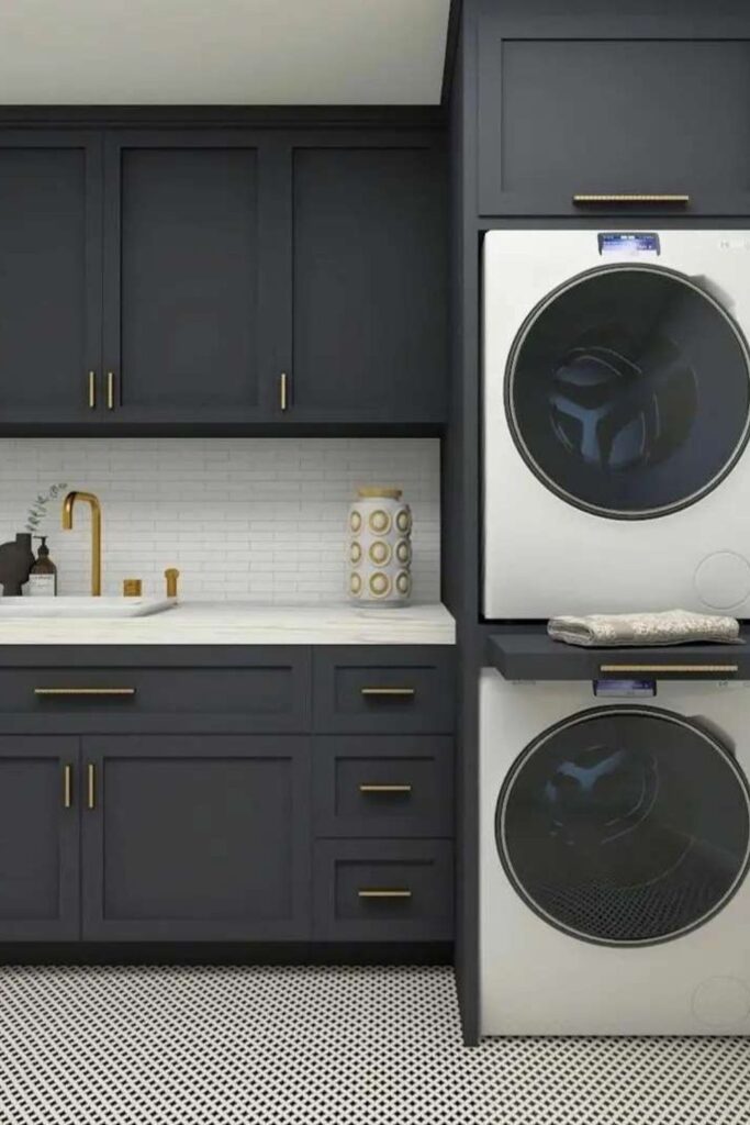 Instead of fighting with everything else, the appliances become part of the cabinets. Putting the washer and dryer on top of each other makes more room on the wall for storage.