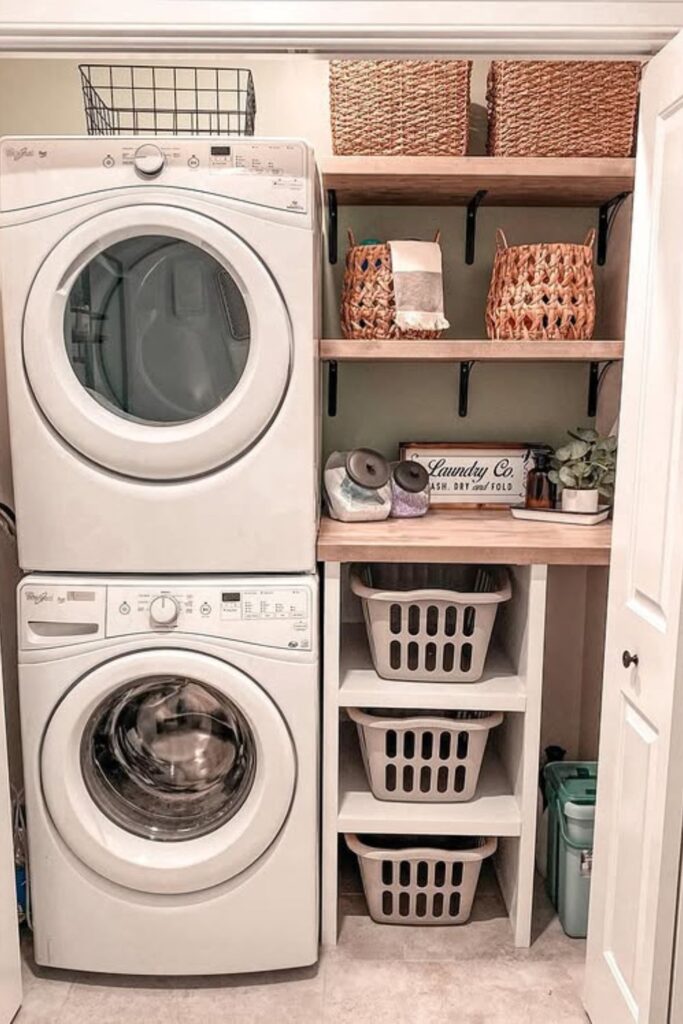 Narrow laundry closets benefit most from storage that climbs upward instead of spreading outward.