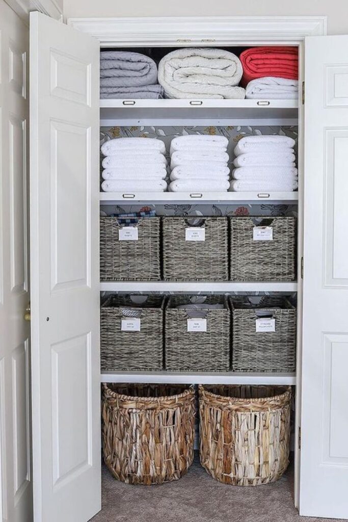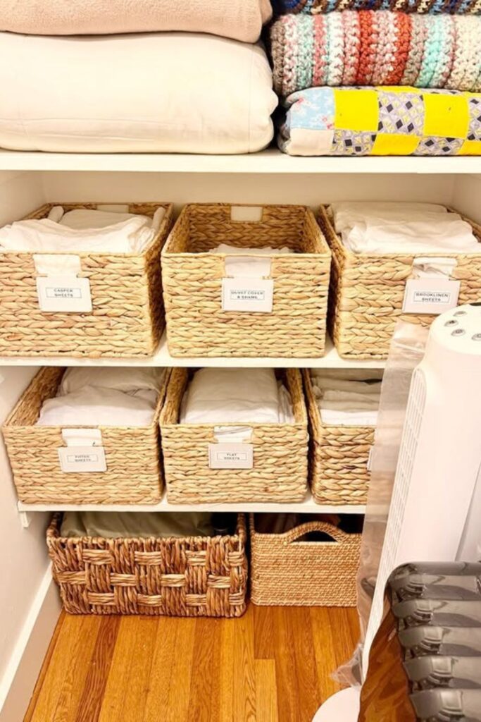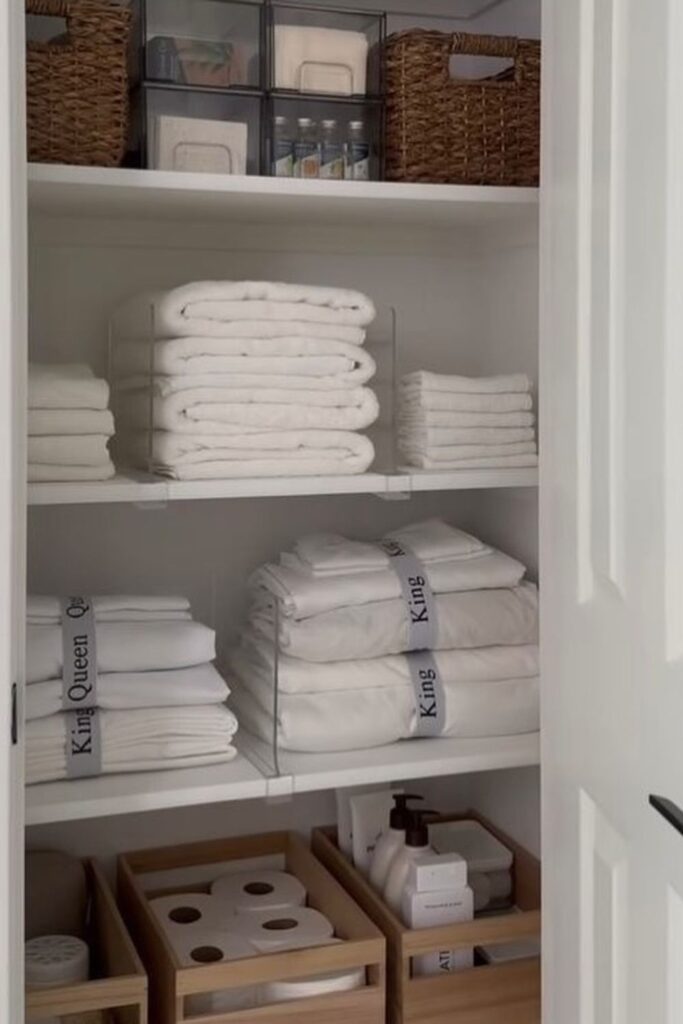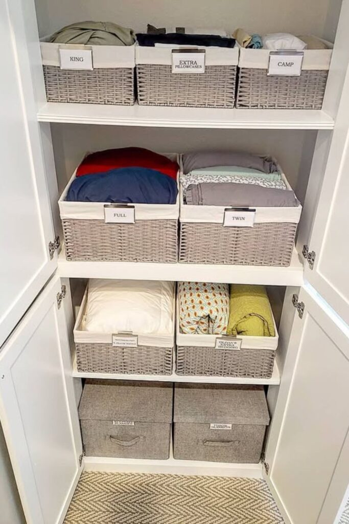 Finding the right sheet set becomes much easier when every basket is clearly labeled. Group linens by type guest sheets, duvet covers, or extra pillowcases.
