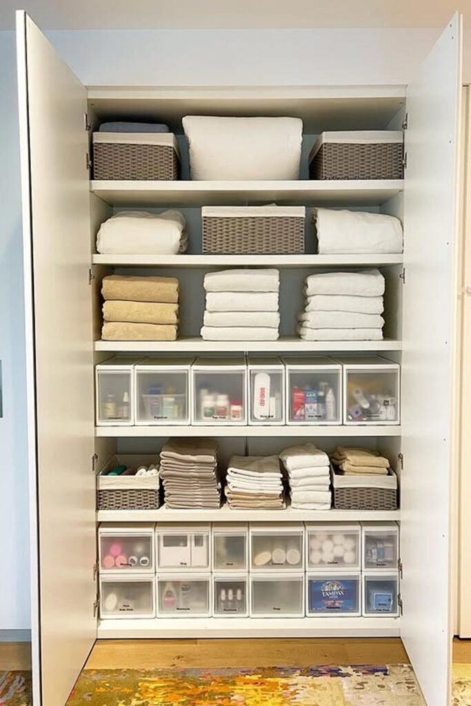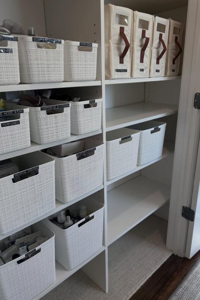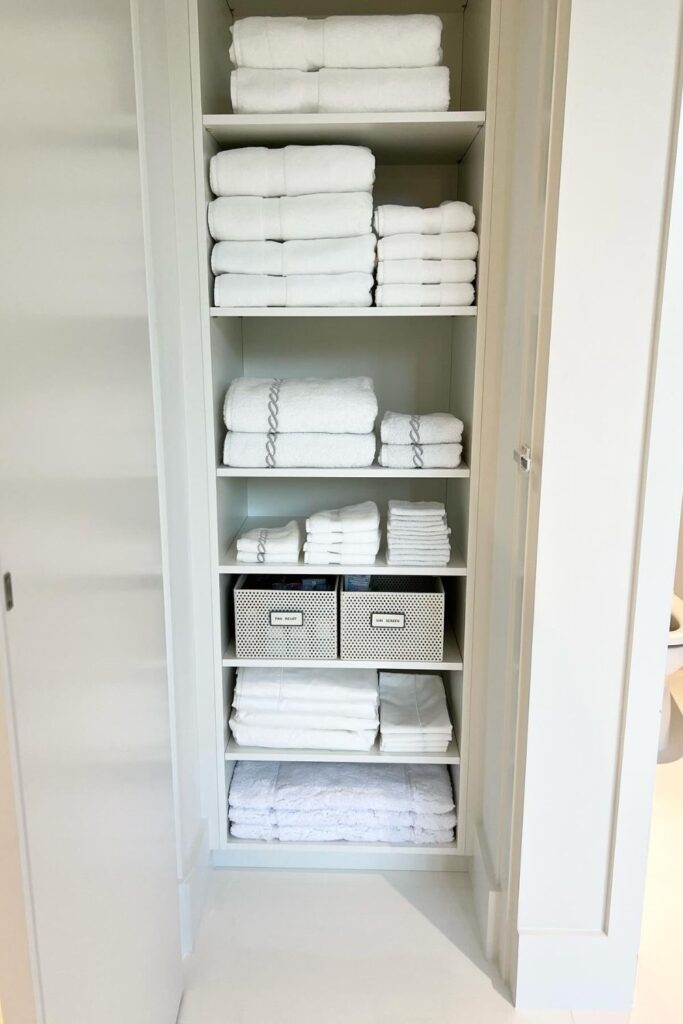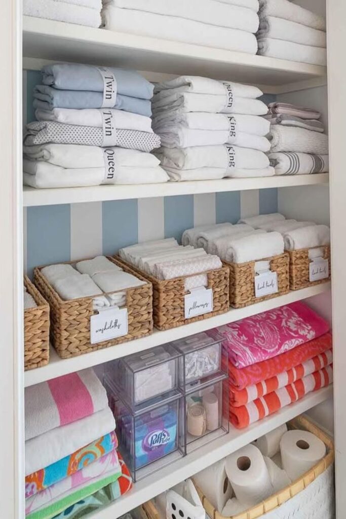Confusion disappears once every shelf clearly tells you what belongs there. Simple labeled bins turn a busy linen closet into an easy grab-and-go system.