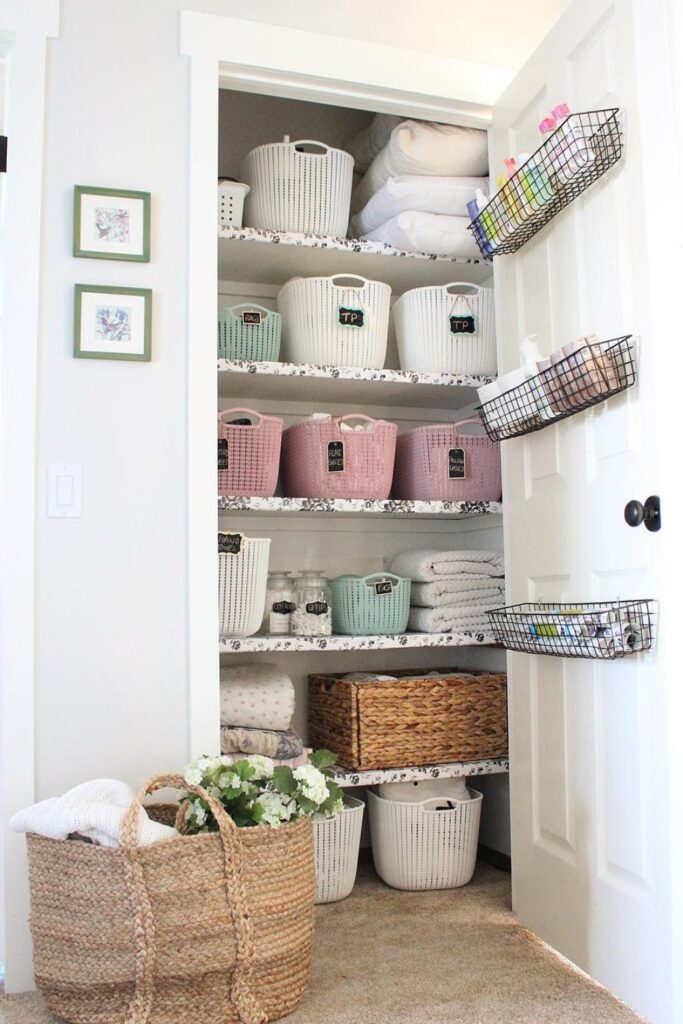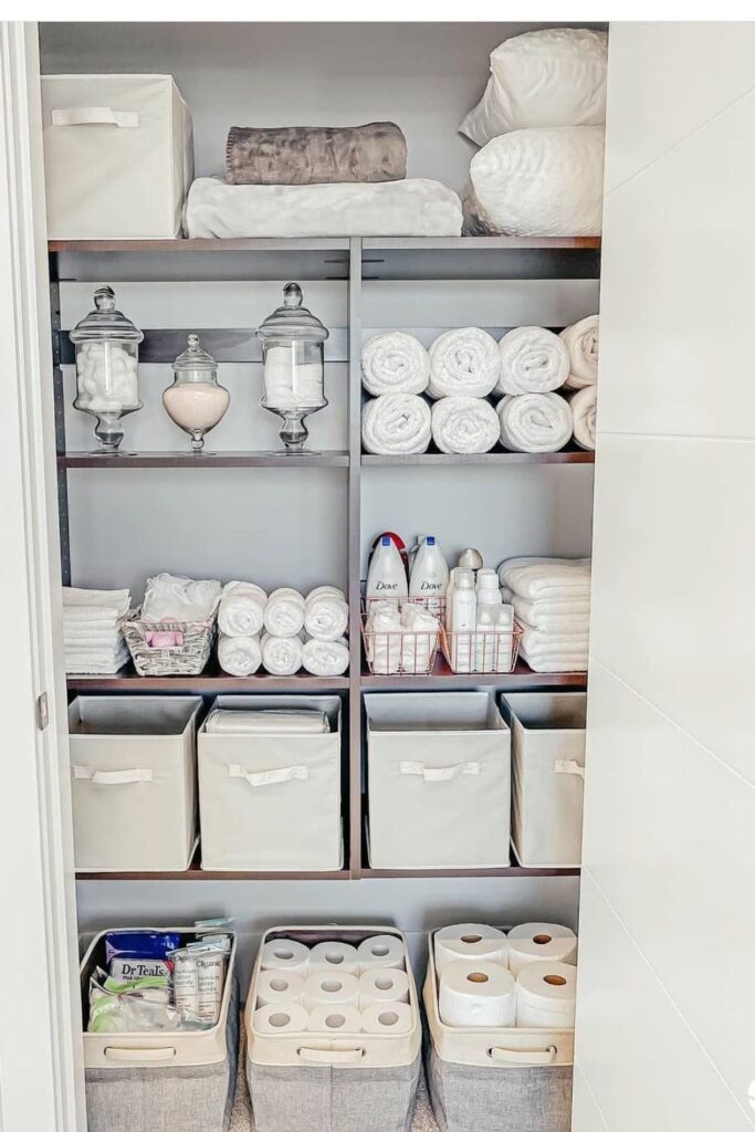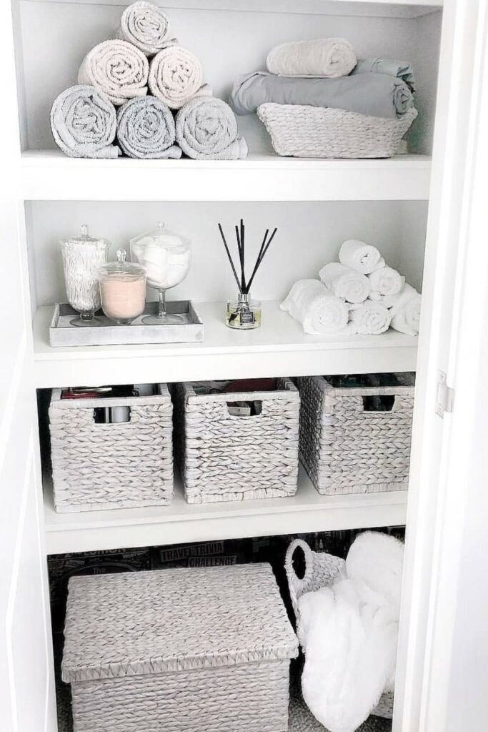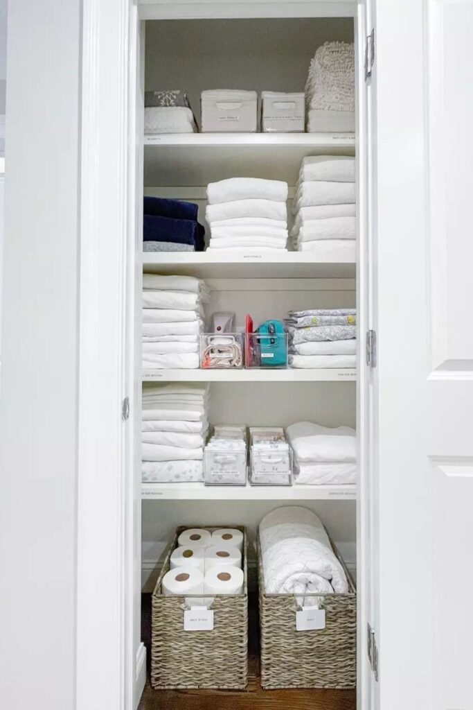 You may keep towels and sheets stacked next to them, and labeled baskets on the bottom shelf can carry things like toilet paper or blankets in quantity.