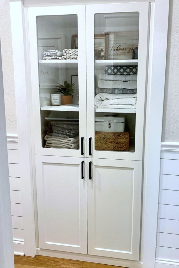 Closed storage keeps linens protected, but glass-front cabinets make the space feel organized instead of hidden.