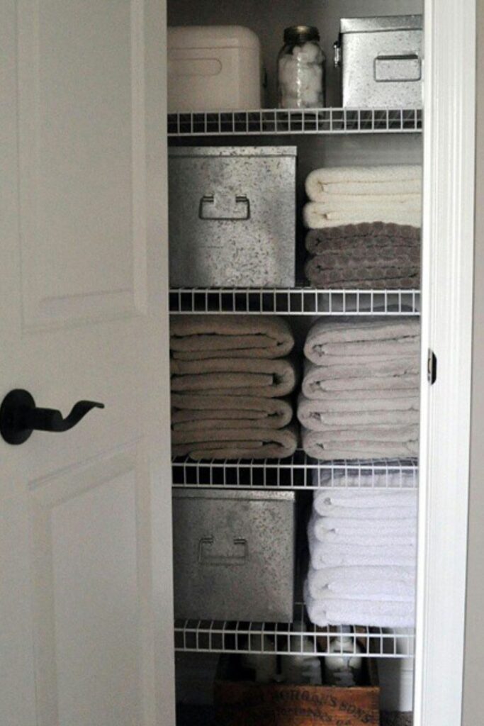 Wire shelves also let more air pass through, which keeps linens fresh when they are stored for a long time. Put everyday towels at eye level so they are easy to reach.