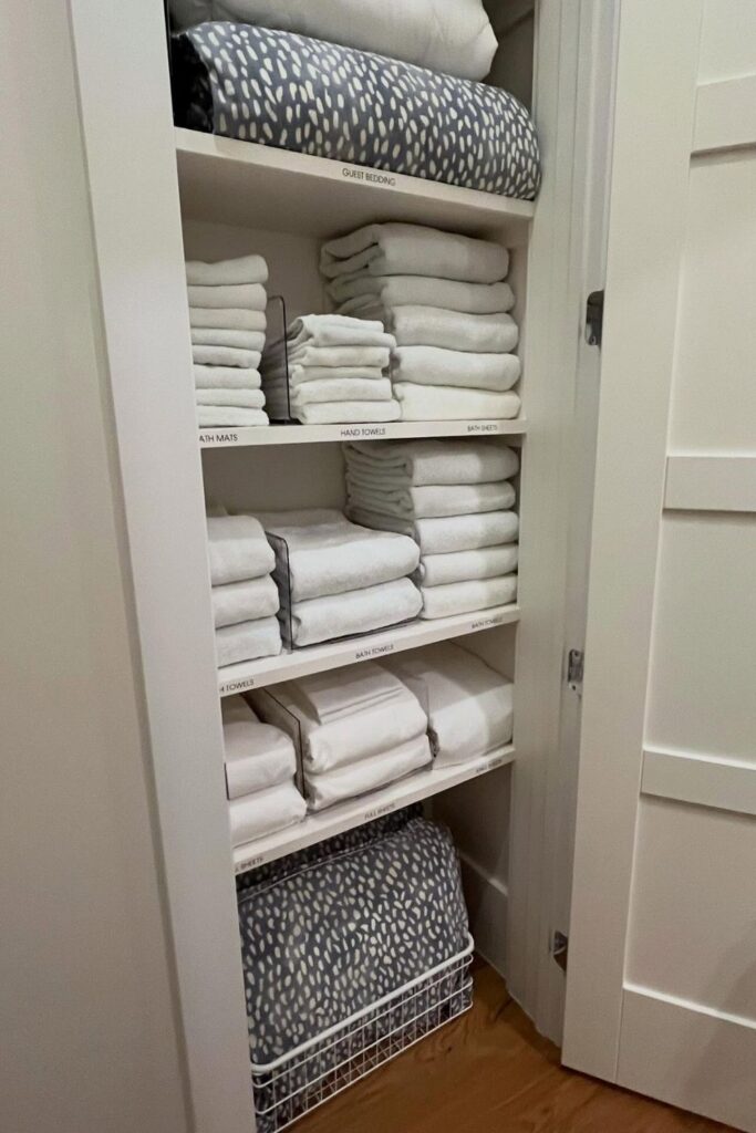 And bath sheets below, so the stacks never get mixed up. Putting simple labels around the edge of the shelf makes it easier for everyone in the house.