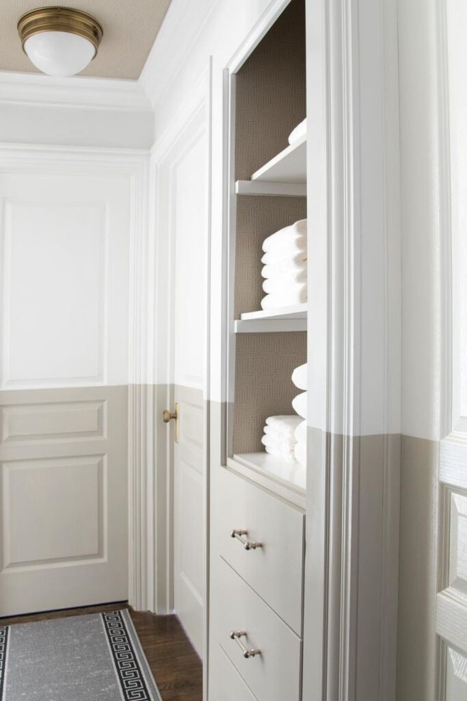 Hallway space often hides the perfect spot for a slim linen cabinet. A built-in unit like this turns an empty wall into organized storage without taking up extra floor space.