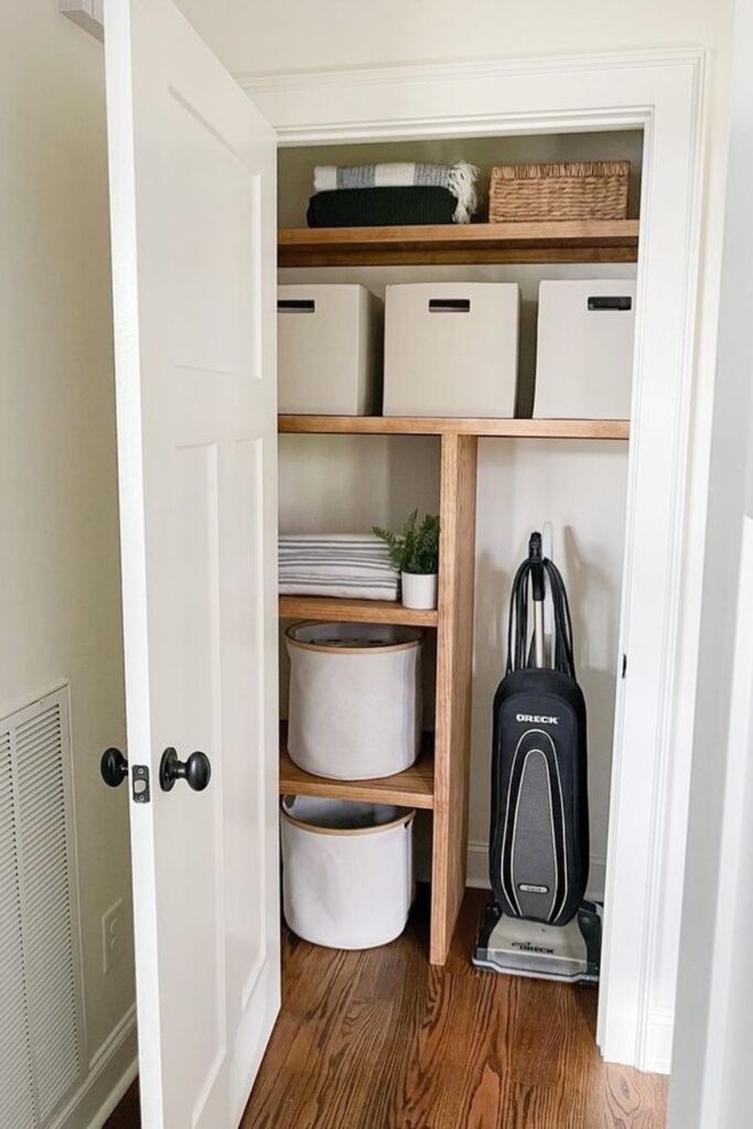 On the other side, there is space for larger items like a vacuum. Put a basic wood panel or shelf unit in the middle of the closet to make this configuration again.