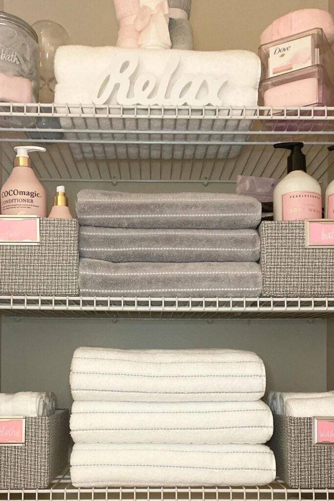 Using baskets or boxes helps keep linens and smaller goods separate so they don’t get mixed up on the shelf.
