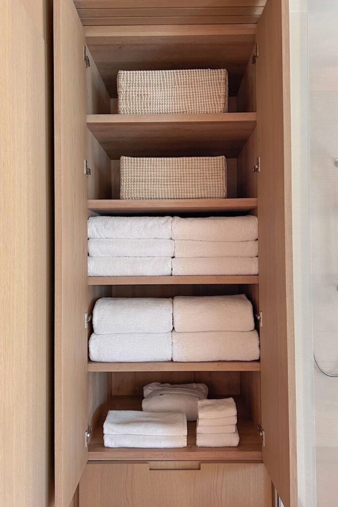 Folded towels are neatly stacked on narrow shelves, and smaller linens or bathroom items can be stored away in lower drawers.