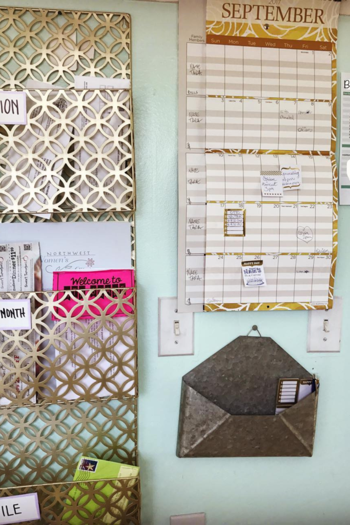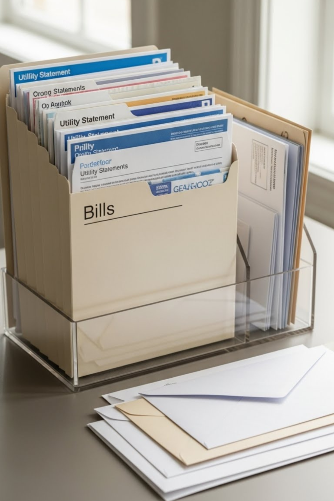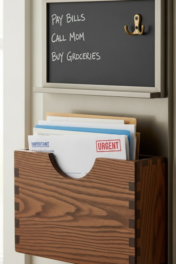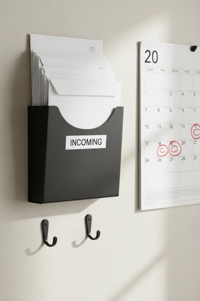 Use a wall pocket or slim holder only for incoming mail, not storage. Pair it with a visible calendar so deadlines don’t hide.