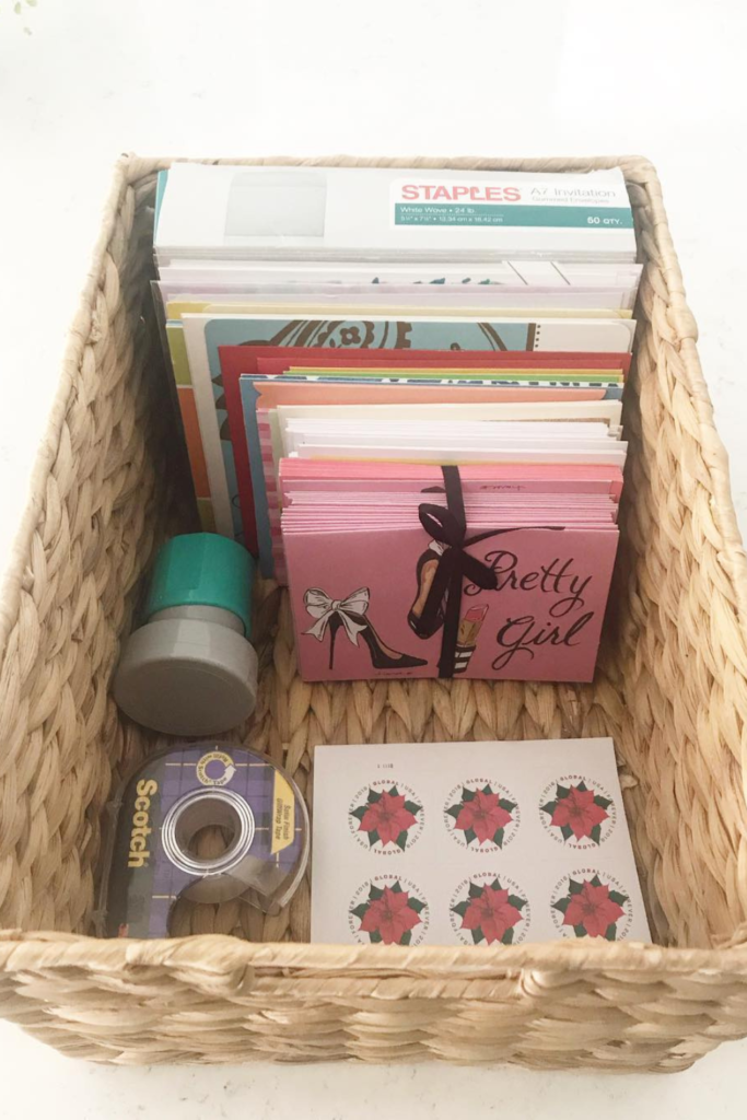 Use a sturdy basket and stand envelopes upright so titles stay visible. Group similar items together to avoid digging later.
