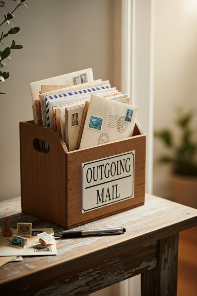 Outgoing mail often gets forgotten after preparation. Create a small bin only for items ready to send. Place it near the door or bag area.