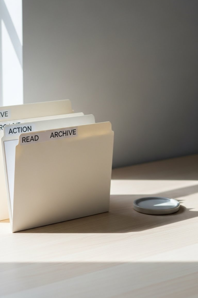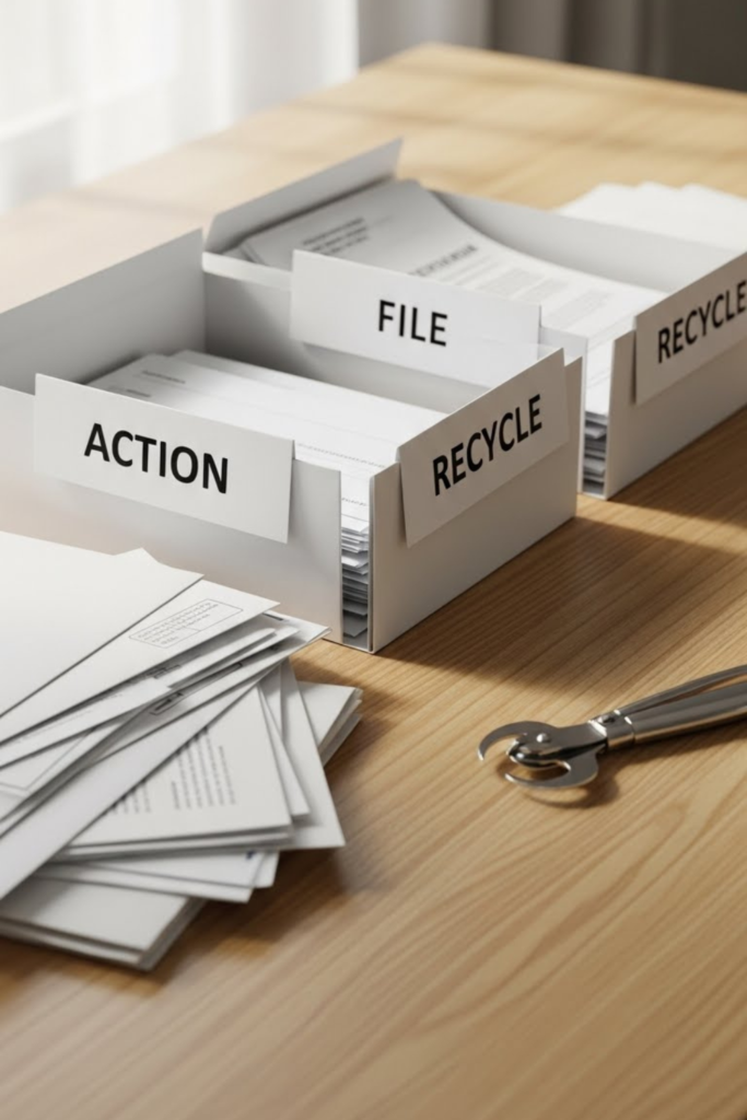 Chaos fades once mail follows a clear path. Split incoming mail into action-needed, current month, and long-term file zones.