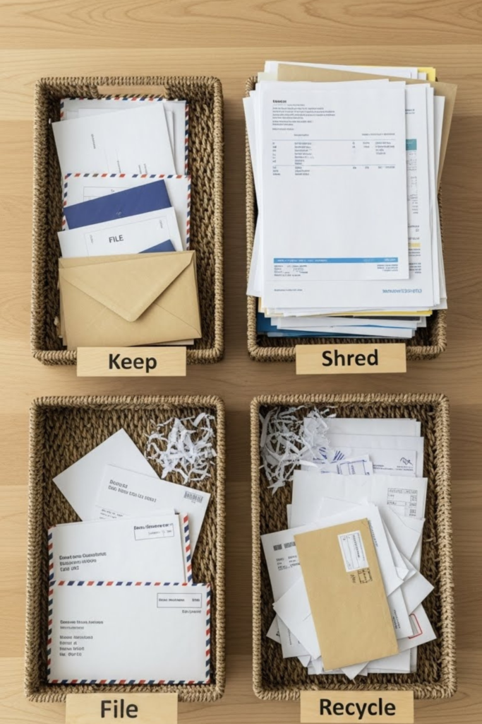 Money-related mail causes the most stress when mixed with everything else. Create a dedicated spot for bills and payment notices only.