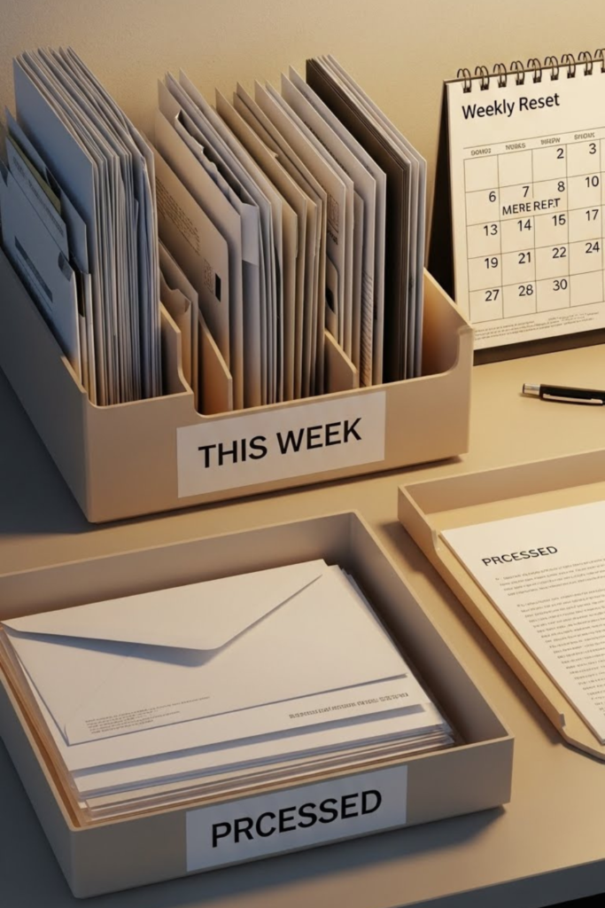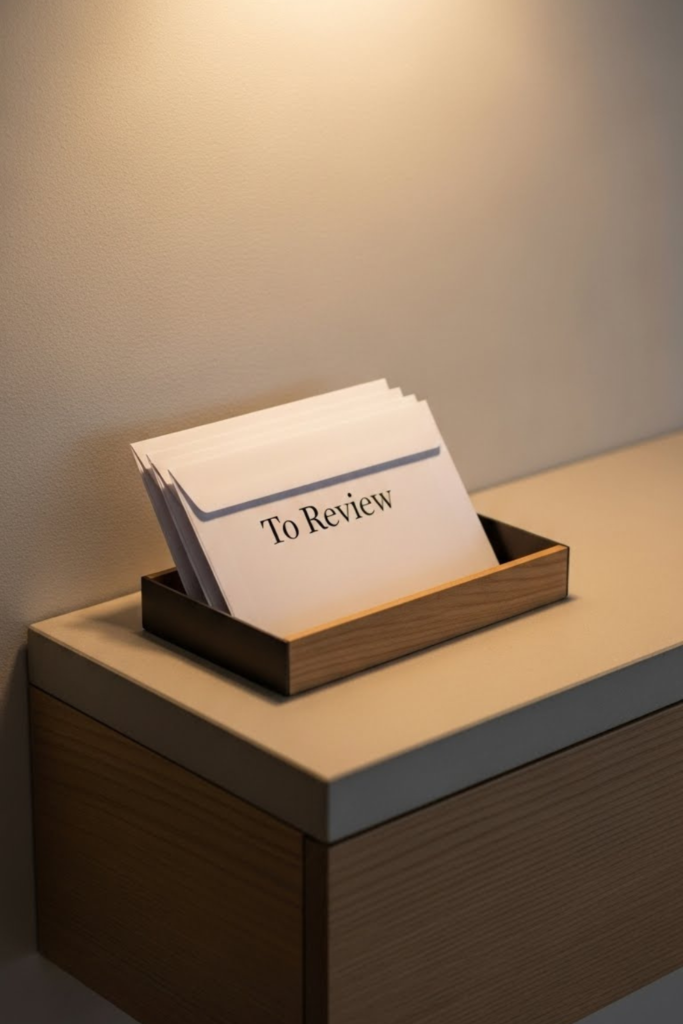 Not all mail needs instant decisions. Use one small tray for short-term holding only. Items stay there no longer than a few days.