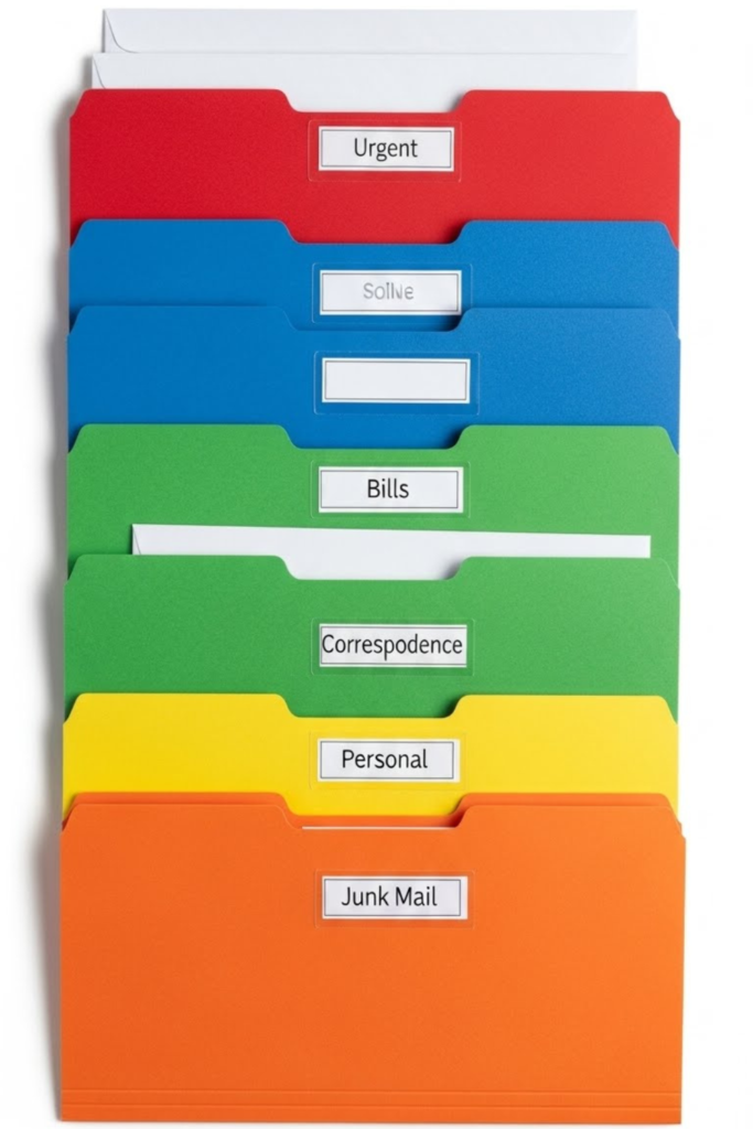 Visual separation helps spot priority mail quickly without having to read. Assign one color per mail type bills, school, personal, work.
