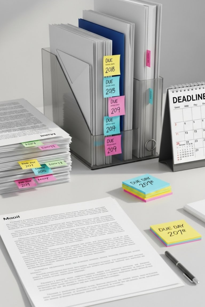 Mail becomes urgent when dates stay visible. Write due dates directly on papers or sticky notes attached to them.