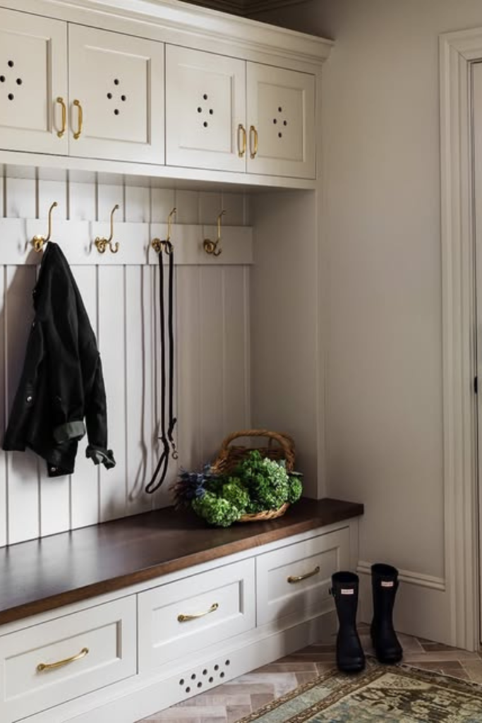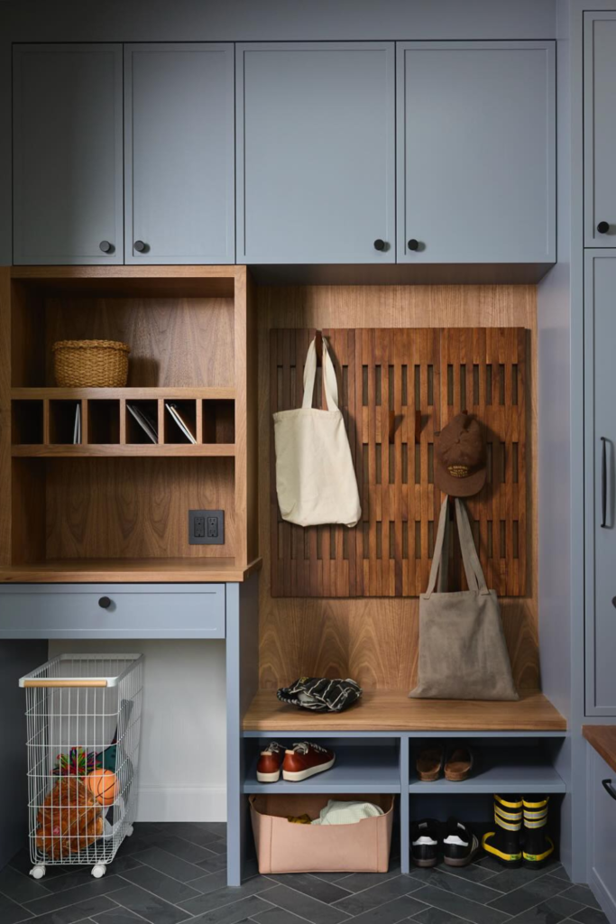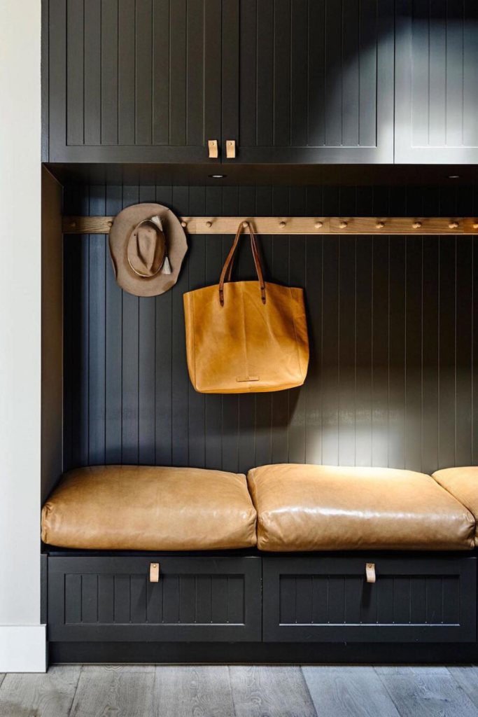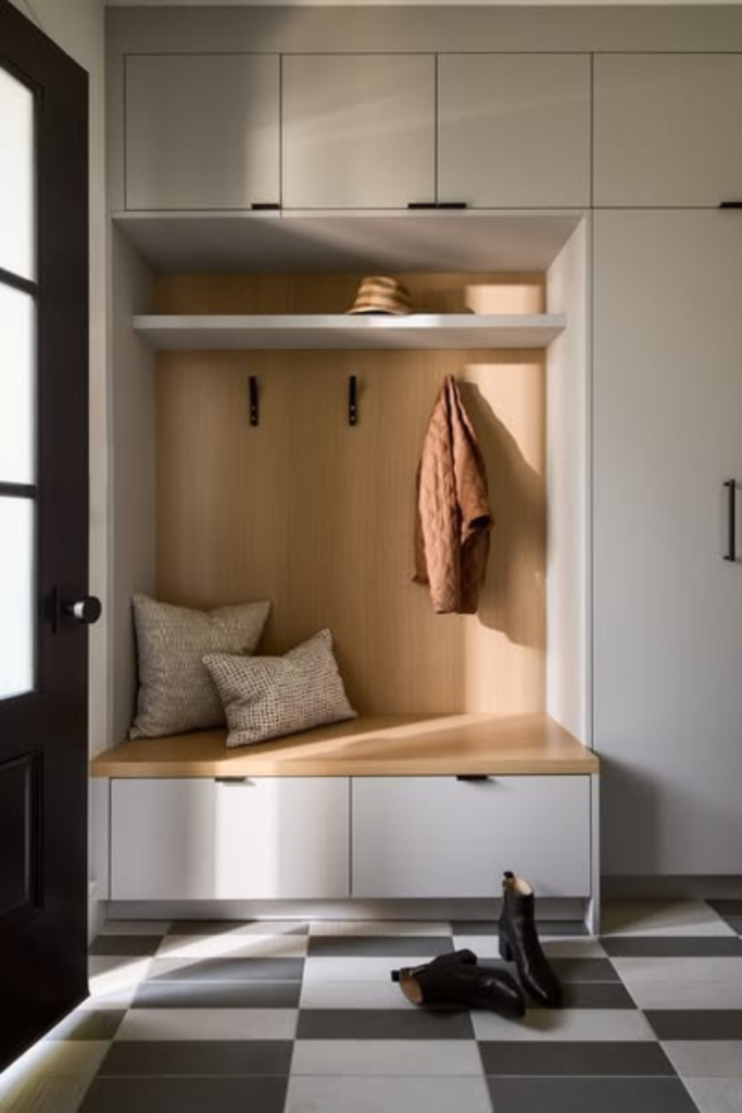 Contrast keeps a mudroom from feeling flat while still staying practical. Wood-backed hook panels create a warm drop zone.
