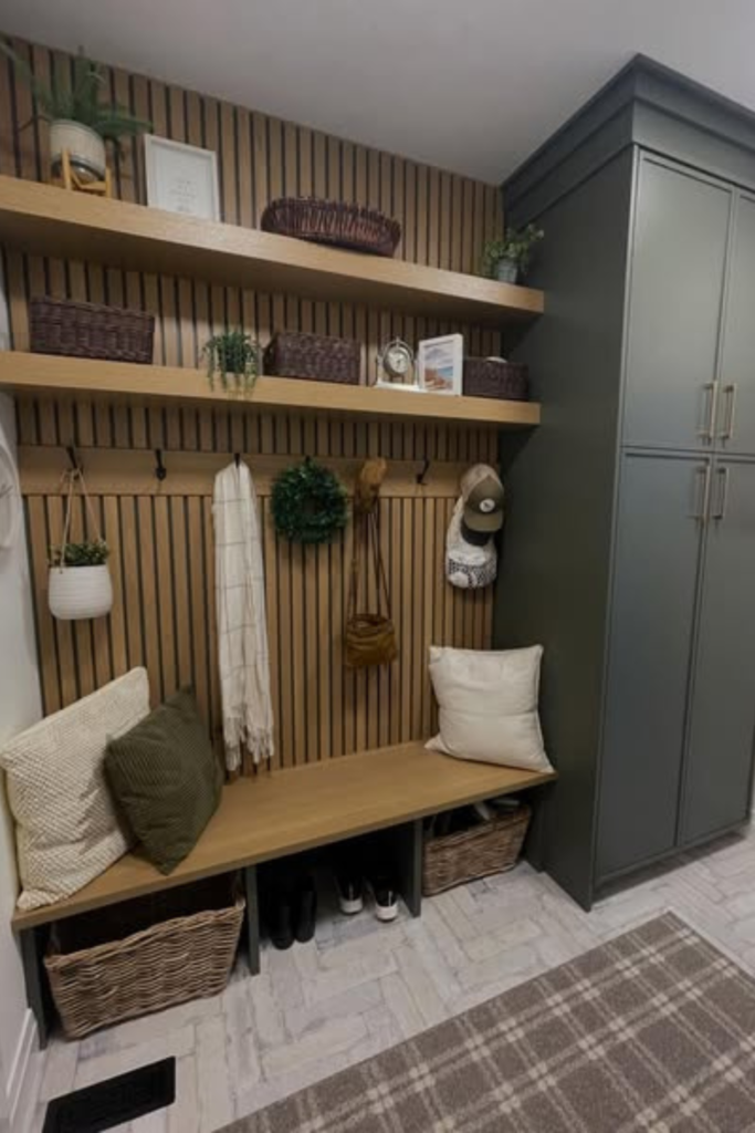 Still giving coats and shoes a defined home. Boxing in a bench between tall cabinets and adding a wood back panel for warmth.