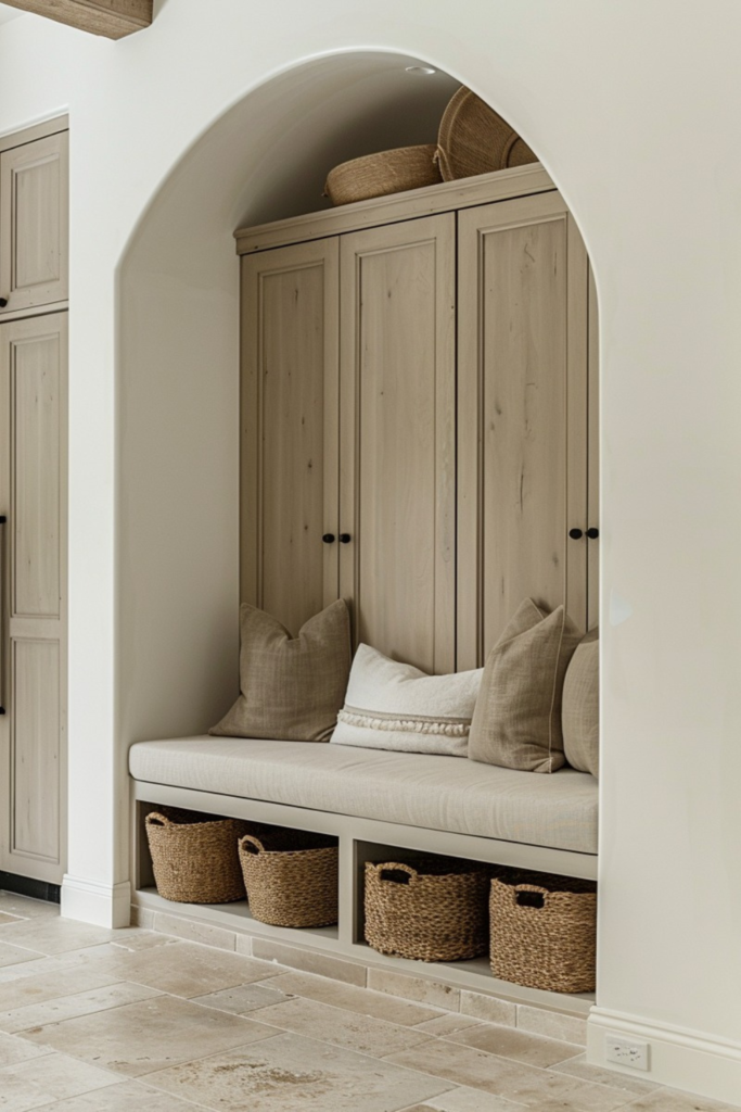 Keeping the room soft and intentional. Framing a bench within an existing arch and adding closed coat cabinets above.