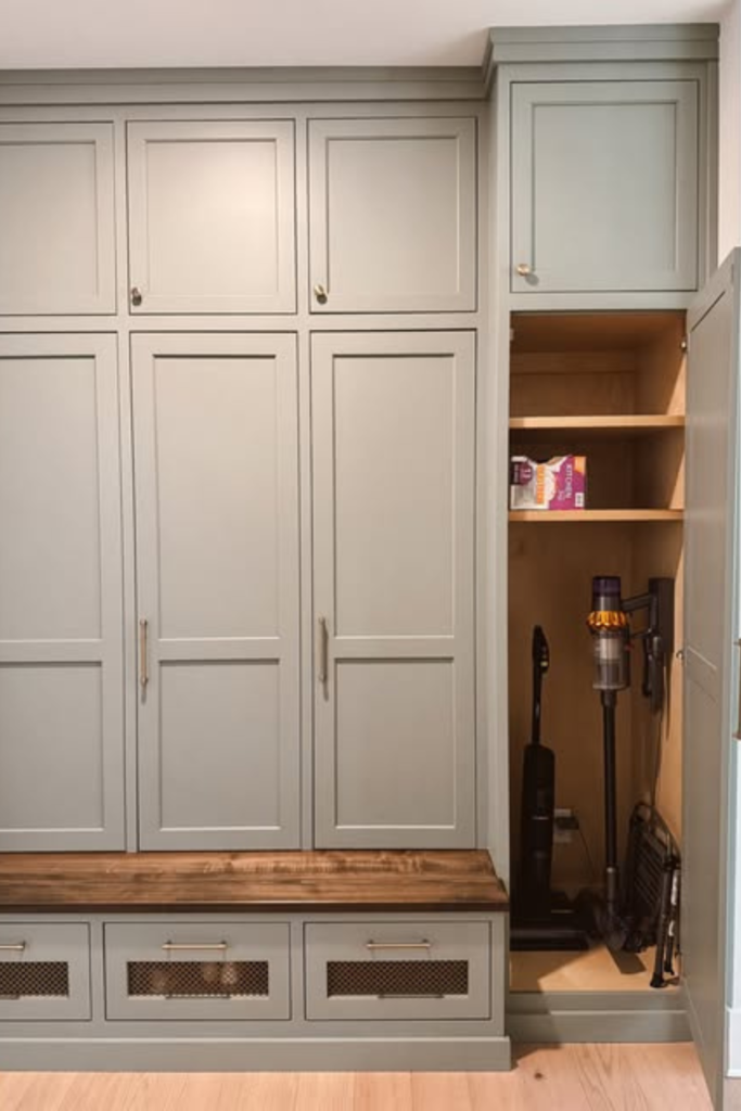 Tall utility cabinet keeps vacuums, supplies, and overflow hidden while the bench zone stays focused on daily use.