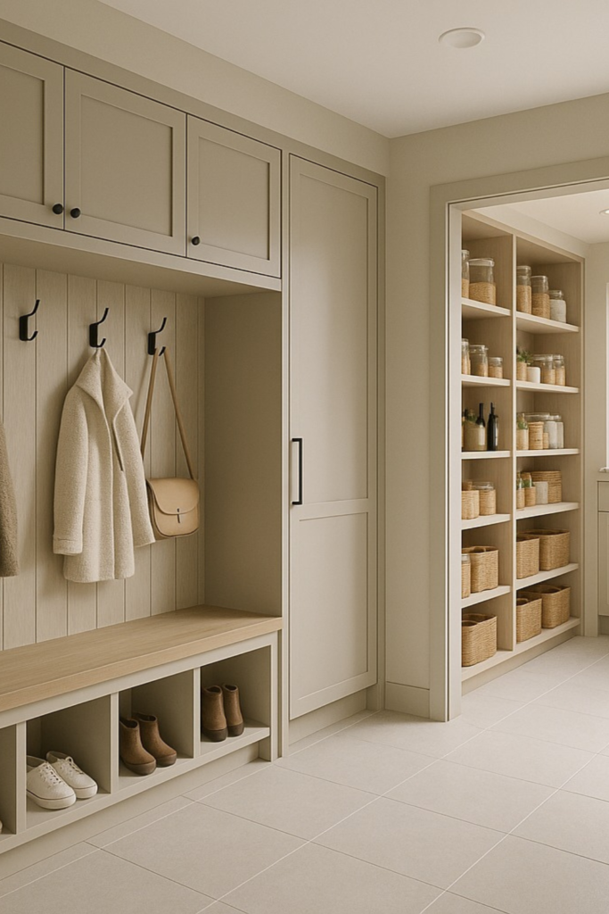 Busy homes benefit when storage zones connect. A mudroom that flows into a pantry lets daily coats and shoes live up front.