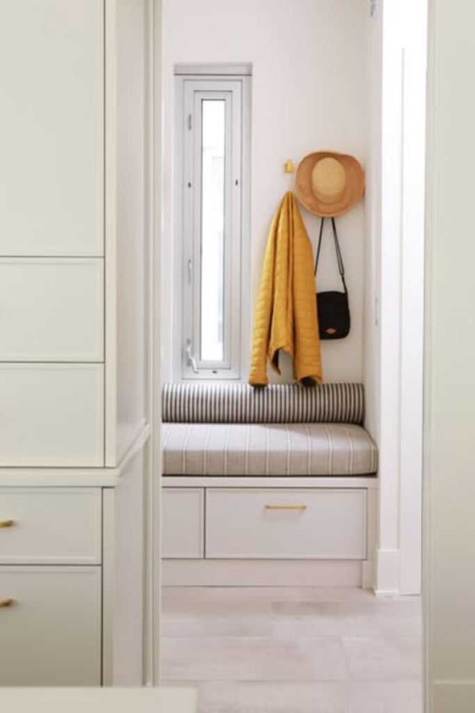 Daylight keeps the area feeling open. Use low bench cabinet sized to the window width and a simple hook set above.