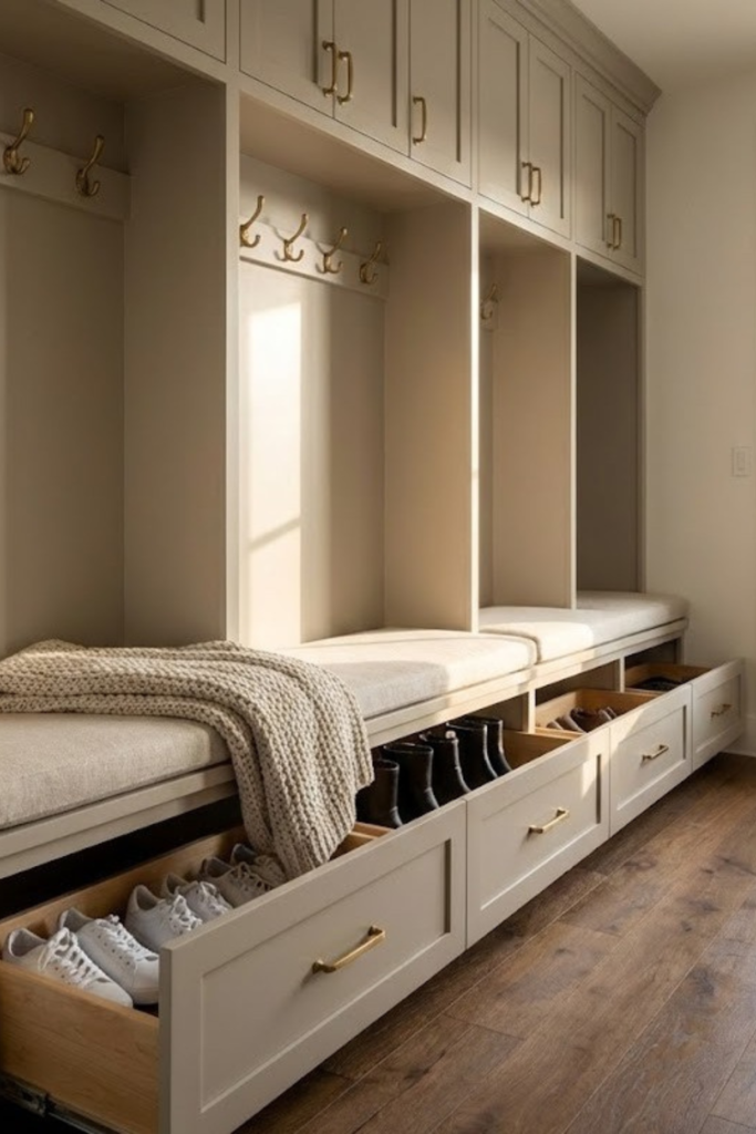 Busy households benefit most from this layout because every person gets a defined zone. Built-ins or modular locker units.
